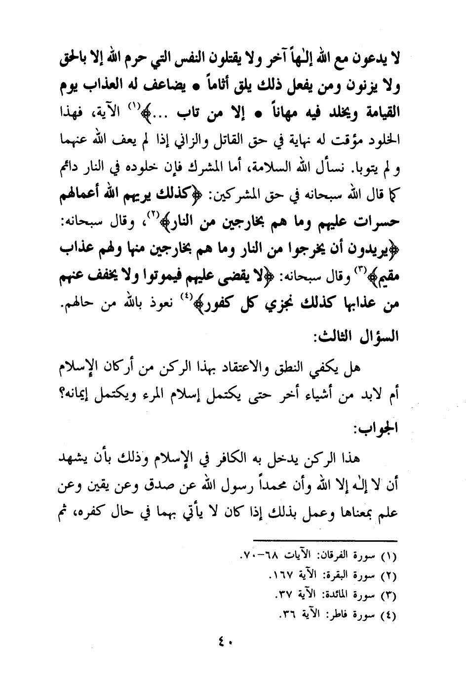 السؤال الثالث: هل يكفي النطق والاعتقاد بهذا الركن من أركان الإسلام أم لا بد من أشياء أخر حتى يكتمل إسلام المرء ويكتمل إيمانه؟ الجواب: هذا الركن يدخل به الكافر في الإسلام وذلك بأن يشهد أن لا إله إلا الله وأن محمدا رسول الله عن صدق وعن يقين وعن علم بمعناها وعمل بذلك إذا كان لا يأتي بهما في حال كفره، ثم