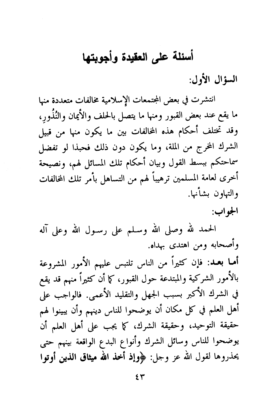 أما بعد: فإن كثيرا من الناس تلتبس عليهم الأمور المشروعة بالأمور الشركية والمبتدعة حول القبور، كما أن كثيرا منهم قد يقع في الشرك الأكبر بسبب الجهل والتقليد الأعمى. فالواجب على أهل العلم في كل مكان أن يوضحوا للناس دينهم وأن يبينوا لهم حقيقة التوحيد، وحقيقة الشرك، كما يجب على أهل العلم أن يوضحوا للناس وسائل الشرك وأنواع البدع الواقعة بينهم حتى يحذروها لقول الله عز وجل: