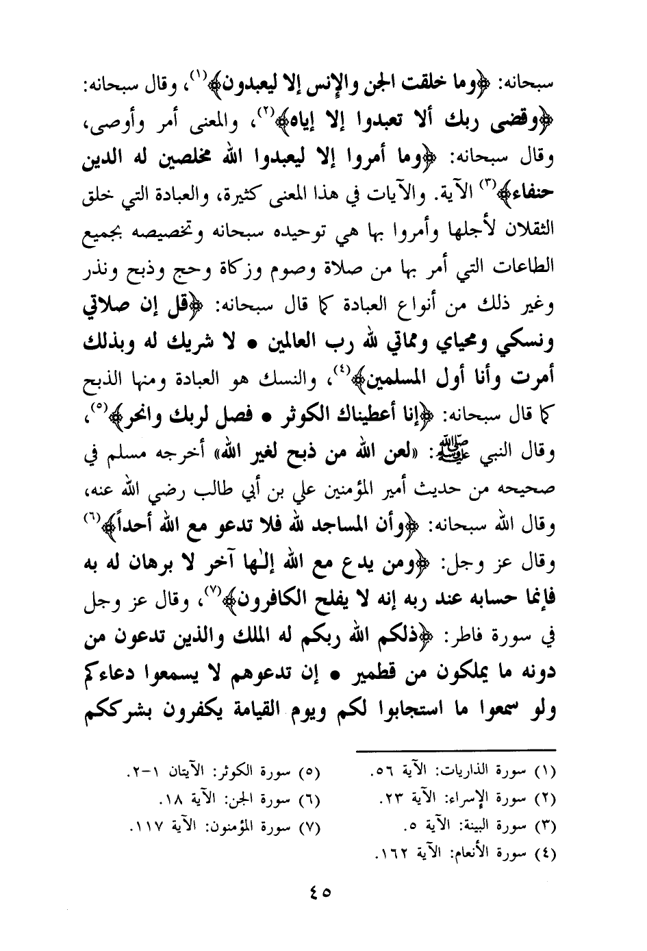 والآيات في هذا المعنى كثيرة، والعبادة التي خلق الثقلان لأجلها وأمروا بها هي توحيده سبحانه وتخصيصه بجميع الطاعات التي أمر بها من صلاة وصوم وزكاة وحج وذبح ونذر وغير ذلك من أنواع العبادة كما قال سبحانه: {قُلْ إِنَّ صَلَاتِي وَنُسُكِي وَمَحْيَايَ وَمَمَاتِي لِلَّهِ رَبِّ الْعَالَمِينَ} (¬4) {لَا شَرِيكَ لَهُ وَبِذَلِكَ أُمِرْتُ وَأَنَا أَوَّلُ الْمُسْلِمِينَ} (¬5) والنسك هو العبادة ومنها الذبح كما قال سبحانه: {إِنَّا أَعْطَيْنَاكَ الْكَوْثَرَ} (¬6) {فَصَلِّ لِرَبِّكَ وَانْحَرْ} (¬7) وقال النبي صلى الله عليه وسلم: «لعن الله من ذبح لغير الله (¬8) » أخرجه مسلم في صحيحه من حديث أمير المؤمنين علي بن أبي طالب رضي الله عنه، وقال الله سبحانه: {وَأَنَّ الْمَسَاجِدَ لِلَّهِ فَلَا تَدْعُوا مَعَ اللَّهِ أَحَدًا} (¬9) وقال عز وجل: {وَمَنْ يَدْعُ مَعَ اللَّهِ إِلَهًا آخَرَ لَا بُرْهَانَ لَهُ بِهِ فَإِنَّمَا حِسَابُهُ عِنْدَ رَبِّهِ إِنَّهُ لَا يُفْلِحُ الْكَافِرُونَ} (¬10) وقال عز وجل في سورة فاطر: {ذَلِكُمُ اللَّهُ رَبُّكُمْ لَهُ الْمُلْكُ وَالَّذِينَ تَدْعُونَ مِنْ دُونِهِ مَا يَمْلِكُونَ مِنْ قِطْمِيرٍ} (¬11) {إِنْ تَدْعُوهُمْ لَا يَسْمَعُوا دُعَاءَكُمْ وَلَوْ سَمِعُوا مَا اسْتَجَابُوا لَكُمْ وَيَوْمَ الْقِيَامَةِ يَكْفُرُونَ بِشِرْكِكُمْ وَلَا يُنَبِّئُكَ مِثْلُ خَبِيرٍ} (¬12)