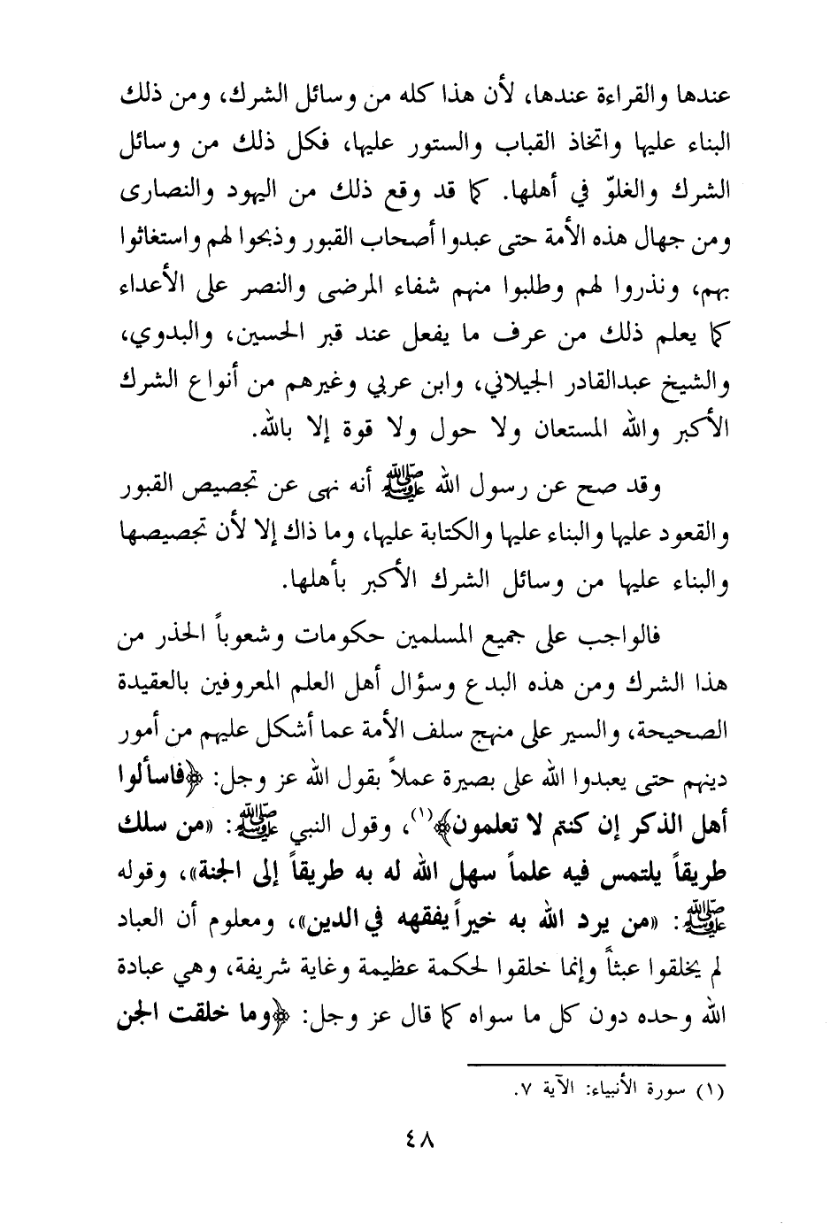 فالواجب على جميع المسلمين حكومات وشعوبا الحذر من هذا الشرك ومن هذه البدع وسؤال أهل العلم المعروفين بالعقيدة الصحيحة، والسير على منهج سلف الأمة عما أشكل عليهم من أمور دينهم حتى يعبدوا الله على بصيرة عملا بقول الله عز وجل: {فَاسْأَلُوا أَهْلَ الذِّكْرِ إِنْ كُنْتُمْ لَا تَعْلَمُونَ} (¬1) وقول النبي صلى الله عليه وسلم: «من سلك طريقا يلتمس فيه علما سهل الله له به طريقا إلى الجنة (¬2) » ، وقوله صلى الله عليه وسلم: «من يرد الله به خيرا يفقهه في الدين (¬3) » .