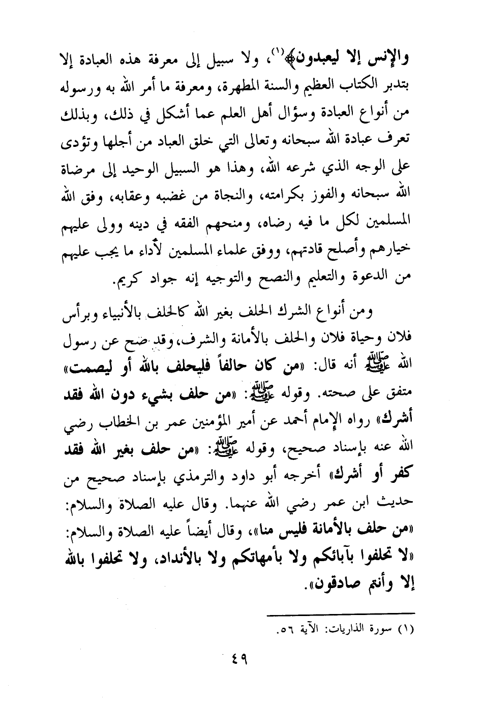 وقوله صلى الله عليه وسلم: «من حلف بشيء دون الله فقد أشرك (¬3) » رواه الإمام أحمد عن أمير المؤمنين عمر بن الخطاب رضي الله عنه بإسناد صحيح، وقوله صلى الله عليه وسلم: «من حلف بغير الله فقد كفر أو أشرك (¬4) » أخرجه أبو داود والترمذي بإسناد صحيح من حديث ابن عمر رضي الله عنهما. وقال عليه الصلاة والسلام: «من حلف بالأمانة فليس منا (¬5) » ، وقال أيضا عليه الصلاة والسلام: «لا تحلفوا بآبائكم ولا بأمهاتكم ولا بالأنداد ولا تحلفوا بالله إلا وأنتم صادقون (¬6) » .