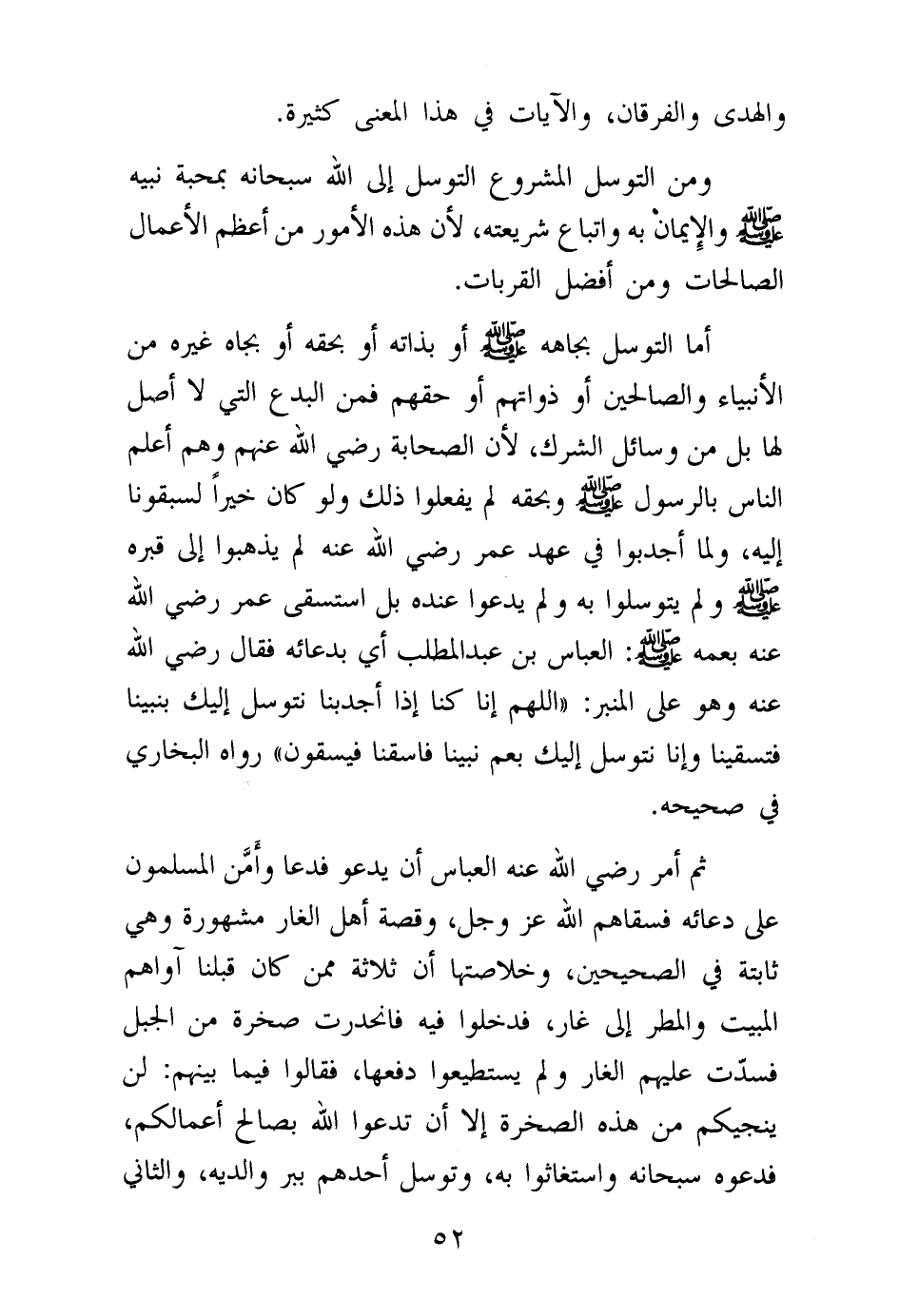 ثم أمر رضي الله عنه العباس أن يدعو فدعا وأمن المسلمون على دعائه فسقاهم الله عز وجل، وقصة أهل الغار مشهورة وهي ثابتة في الصحيحين، وخلاصتها أن ثلاثة ممن كان قبلنا آواهم المبيت والمطر إلى غار، فدخلوا فيه فانحدرت صخرة من الجبل فسدت عليهم الغار ولم يستطيعوا دفعها، فقالوا فيما بينهم: لن ينجيكم من هذه الصخرة إلا أن تدعوا الله بصالح أعمالكم، فدعوه سبحانه واستغاثوا به، وتوسل أحدهم ببر والديه، والثاني