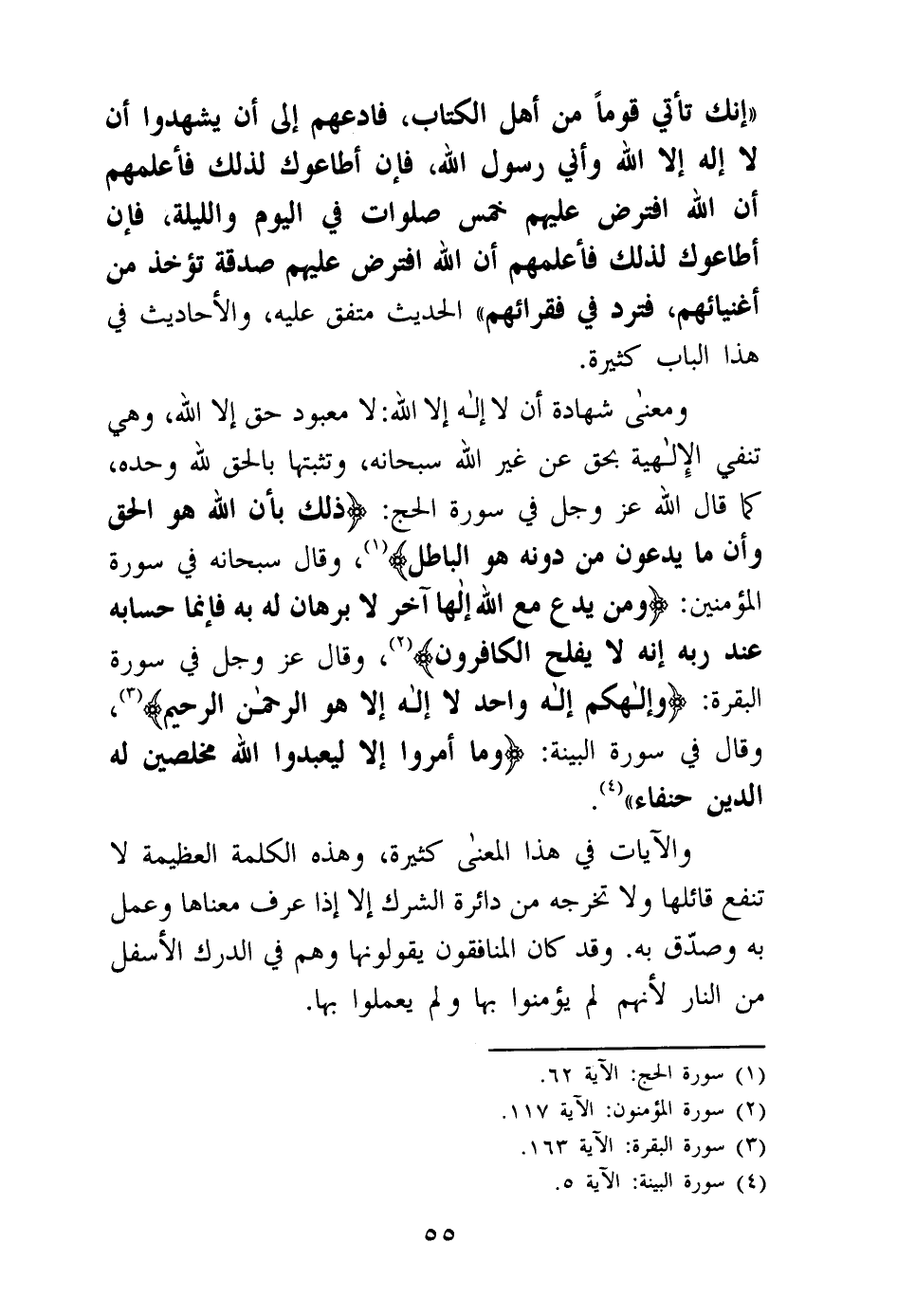 ومعنى شهادة أن لا إله إلا الله: لا معبود حق إلا الله، وهي تنفي الإلهية بحق عن غير الله سبحانه، وتثبتها بالحق لله وحده، كما قال الله عز وجل في سورة الحج: {ذَلِكَ بِأَنَّ اللَّهَ هُوَ الْحَقُّ وَأَنَّ مَا يَدْعُونَ مِنْ دُونِهِ هُوَ الْبَاطِلُ} (¬2) وقال سبحانه في سورة المؤمنين: {وَمَنْ يَدْعُ مَعَ اللَّهِ إِلَهًا آخَرَ لَا بُرْهَانَ لَهُ بِهِ فَإِنَّمَا حِسَابُهُ عِنْدَ رَبِّهِ إِنَّهُ لَا يُفْلِحُ الْكَافِرُونَ} (¬3) وقال عز وجل في سورة البقرة: {وَإِلَهُكُمْ إِلَهٌ وَاحِدٌ لَا إِلَهَ إِلَّا هُوَ الرَّحْمَنُ الرَّحِيمُ} (¬4) وقال في سورة البينة: {وَمَا أُمِرُوا إِلَّا لِيَعْبُدُوا اللَّهَ مُخْلِصِينَ لَهُ الدِّينَ حُنَفَاءَ} (¬5) والآيات في هذا المعنى كثيرة، وهذه الكلمة العظيمة لا تنفع قائلها ولا تخرجه من دائرة الشرك إلا إذا عرف معناها وعمل به وصدق به.