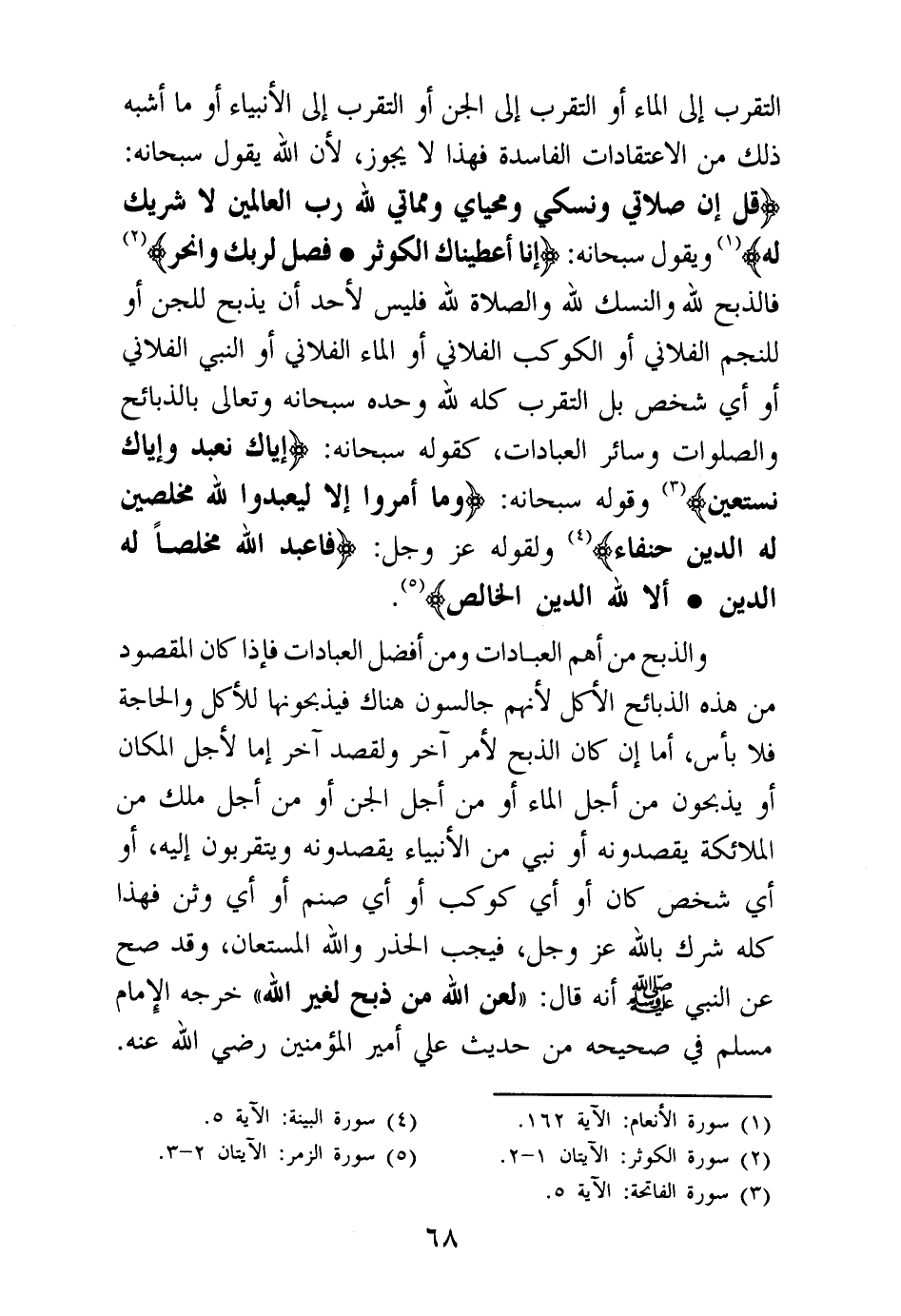 فالذبح لله والنسك لله والصلاة لله فليس لأحد أن يذبح للجن أو للنجم الفلاني أو الكوكب الفلاني أو الماء الفلاني أو النبي الفلاني أو أي شخص بل التقرب كله لله وحده سبحانه وتعالى بالذبائح والصلوات وسائر العبادات، كقوله سبحانه: {إِيَّاكَ نَعْبُدُ وَإِيَّاكَ نَسْتَعِينُ} (¬5) وقوله سبحانه: {وَمَا أُمِرُوا إِلَّا لِيَعْبُدُوا اللَّهَ مُخْلِصِينَ لَهُ الدِّينَ حُنَفَاءَ} (¬6) ولقوله عز وجل: {فَاعْبُدِ اللَّهَ مُخْلِصًا لَهُ الدِّينَ} (¬7) {أَلَا لِلَّهِ الدِّينُ الْخَالِصُ} (¬8)