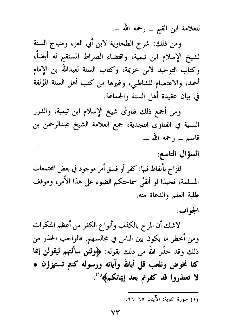 لا شك أن المزح بالكذب وأنواع الكفر من أعظم المنكرات ومن أخطر ما يكون بين الناس في مجالسهم. فالواجب الحذر من ذلك وقد حذر الله من ذلك بقوله: {وَلَئِنْ سَأَلْتَهُمْ لَيَقُولُنَّ إِنَّمَا كُنَّا نَخُوضُ وَنَلْعَبُ قُلْ أَبِاللَّهِ وَآيَاتِهِ وَرَسُولِهِ كُنْتُمْ تَسْتَهْزِئُونَ} (¬1) {لَا تَعْتَذِرُوا قَدْ كَفَرْتُمْ بَعْدَ إِيمَانِكُمْ} (¬2)