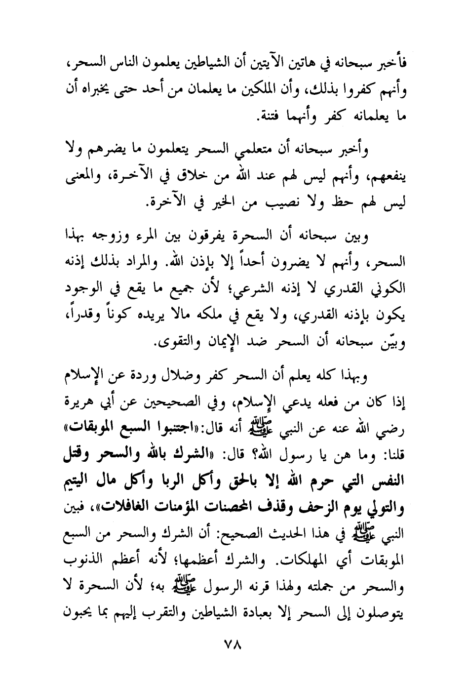 وبهذا كله يعلم أن السحر كفر وضلال وردة عن الإسلام إذا كان من فعله يدعي الإسلام، وفي الصحيحين عن أبي هريرة رضي الله عنه عن النبي صلى الله عليه وسلم أنه قال: «اجتنبوا السبع الموبقات قلنا: وما هن يا رسول الله؟ قال الشرك بالله والسحر وقتل النفس التي حرم الله إلا بالحق وأكل الربا وأكل مال اليتيم والتولي يوم الزحف وقذف المحصنات المؤمنات الغافلات (¬1) » ، فبين النبي. في هذا الحديث الصحيح: أن الشرك والسحر من السبع الموبقات أي المهلكات. والشرك أعظمها؛ لأنه أعظم الذنوب والسحر من جملته ولهذا قرنه الرسول صلى الله عليه وسلم به؛ لأن السحرة لا يتوصلون إلى السحر إلا بعبادة الشياطين والتقرب إليهم بما يحبون
