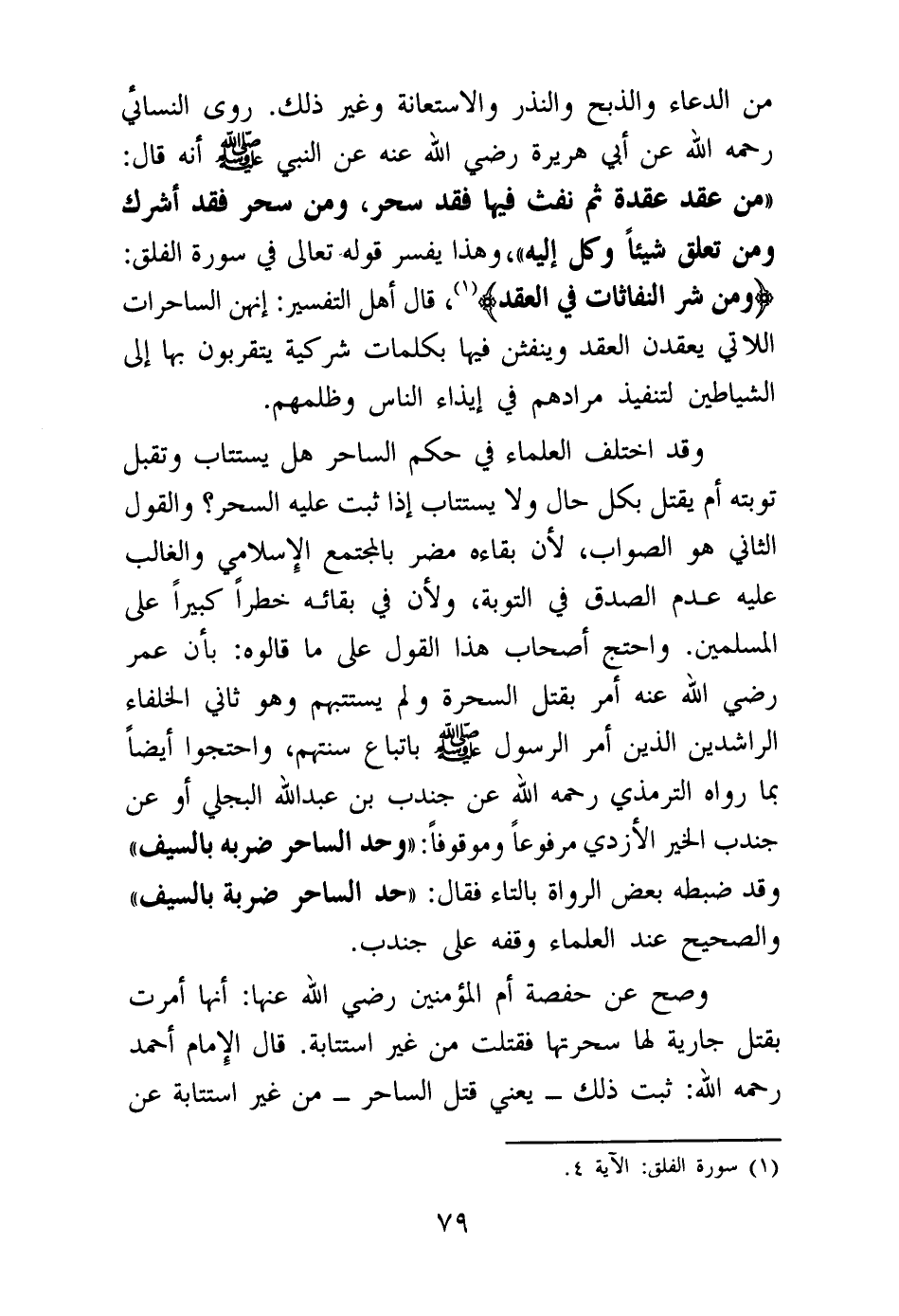 روى النسائي رحمه الله عن أبي هريرة رضي الله عنه عن النبي صلى الله عليه وسلم أنه قال: «من عقد عقدة ثم نفث فيها فقد سحر ومن سحر فقد أشرك ومن تعلق شيئا وكل إليه (¬1) » وهذا يفسر قوله تعالى في سورة الفلق: {وَمِنْ شَرِّ النَّفَّاثَاتِ فِي الْعُقَدِ} (¬2) قال أهل التفسير: إنهن الساحرات اللاتي يعقدن العقد وينفثن فيها بكلمات شركية يتقربون بها إلى الشياطين لتنفيذ مرادهم في إيذاء الناس وظلمهم.