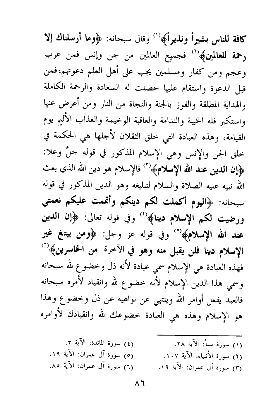 فجميع العالمين من جن وإنس فمن عرب وعجم ومن كفار ومسلمين يجب على أهل العلم دعوتهم، فمن قبل الدعوة واستقام عليها حصلت له السعادة والرحمة الكاملة والهداية المطلقة والفوز بالجنة والنجاة من النار ومن أعرض عنها واستكبر فله الخيبة والندامة والعاقبة الوخيمة والعذاب الأليم يوم القيامة، وهذه العبادة التي خلق الثقلان لأجلها هي الحكمة في خلق الجن والإنس وهي الإسلام المذكور في قوله جل وعلا: {إِنَّ الدِّينَ عِنْدَ اللَّهِ الْإِسْلَامُ} (¬2) فالإسلام هو دين الله الذي بعث الله نبيه عليه الصلاة والسلام لتبليغه وهو الدين المذكور في قوله سبحانه: {الْيَوْمَ أَكْمَلْتُ لَكُمْ دِينَكُمْ وَأَتْمَمْتُ عَلَيْكُمْ نِعْمَتِي وَرَضِيتُ لَكُمُ الْإِسْلَامَ دِينًا} (¬3) وفي قوله تعالى: {إِنَّ الدِّينَ عِنْدَ اللَّهِ الْإِسْلَامُ} (¬4) وفي قوله عز وجل: {وَمَنْ يَبْتَغِ غَيْرَ الْإِسْلَامِ دِينًا فَلَنْ يُقْبَلَ مِنْهُ وَهُوَ فِي الْآخِرَةِ مِنَ الْخَاسِرِينَ} (¬5)