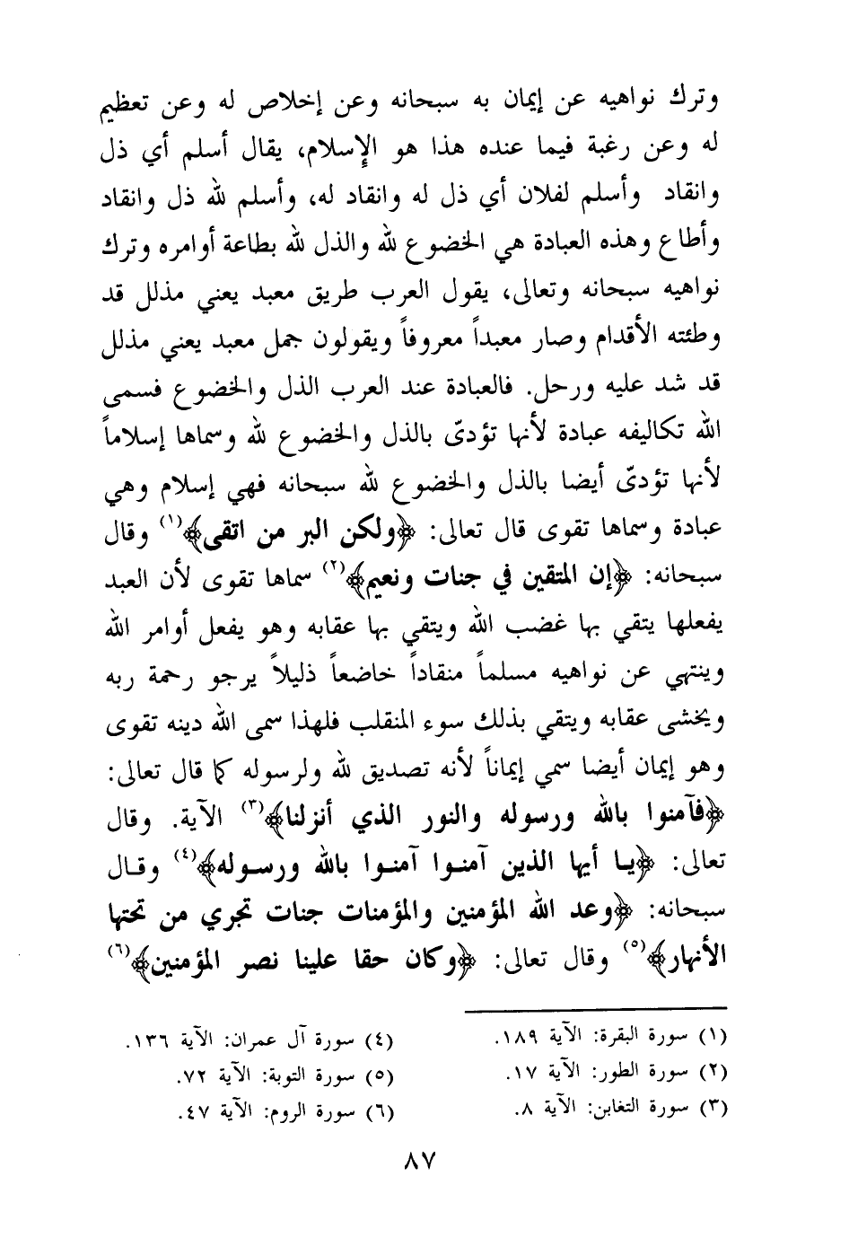 فالعبادة عند العرب الذل والخضوع فسمى الله تكاليفه عبادة لأنها تؤدى بالذل والخضوع لله وسماها إسلاما لأنها تؤدى أيضا بالذل والخضوع لله سبحانه فهي إسلام وهي عبادة وسماها تقوى قال تعالى: {وَلَكِنَّ الْبِرَّ مَنِ اتَّقَى} (¬1) وقال سبحانه: {إِنَّ الْمُتَّقِينَ فِي جَنَّاتٍ وَنَعِيمٍ} (¬2) سماها تقوى لأن العبد يفعلها يتقي بها غضب الله ويتقي بها عقابه وهو يفعل أوامر الله وينتهي عن نواهيه مسلما منقادا خاضعا ذليلا يرجو رحمة ربه ويخشى عقابه ويتقي بذلك سوء المنقلب فلهذا سمى الله دينه تقوى وهو إيمان أيضا سمي إيمانا لأنه تصديق لله ولرسوله كما قال تعالى: {فَآمِنُوا بِاللَّهِ وَرَسُولِهِ وَالنُّورِ الَّذِي أَنْزَلْنَا} (¬3) الآية. وقال تعالى: {يَا أَيُّهَا الَّذِينَ آمَنُوا آمِنُوا بِاللَّهِ وَرَسُولِهِ} (¬4) وقال سبحانه: {وَعَدَ اللَّهُ الْمُؤْمِنِينَ وَالْمُؤْمِنَاتِ جَنَّاتٍ تَجْرِي مِنْ تَحْتِهَا الْأَنْهَارُ} (¬5) وقال تعالى: {وَكَانَ حَقًّا عَلَيْنَا نَصْرُ الْمُؤْمِنِينَ} (¬6)