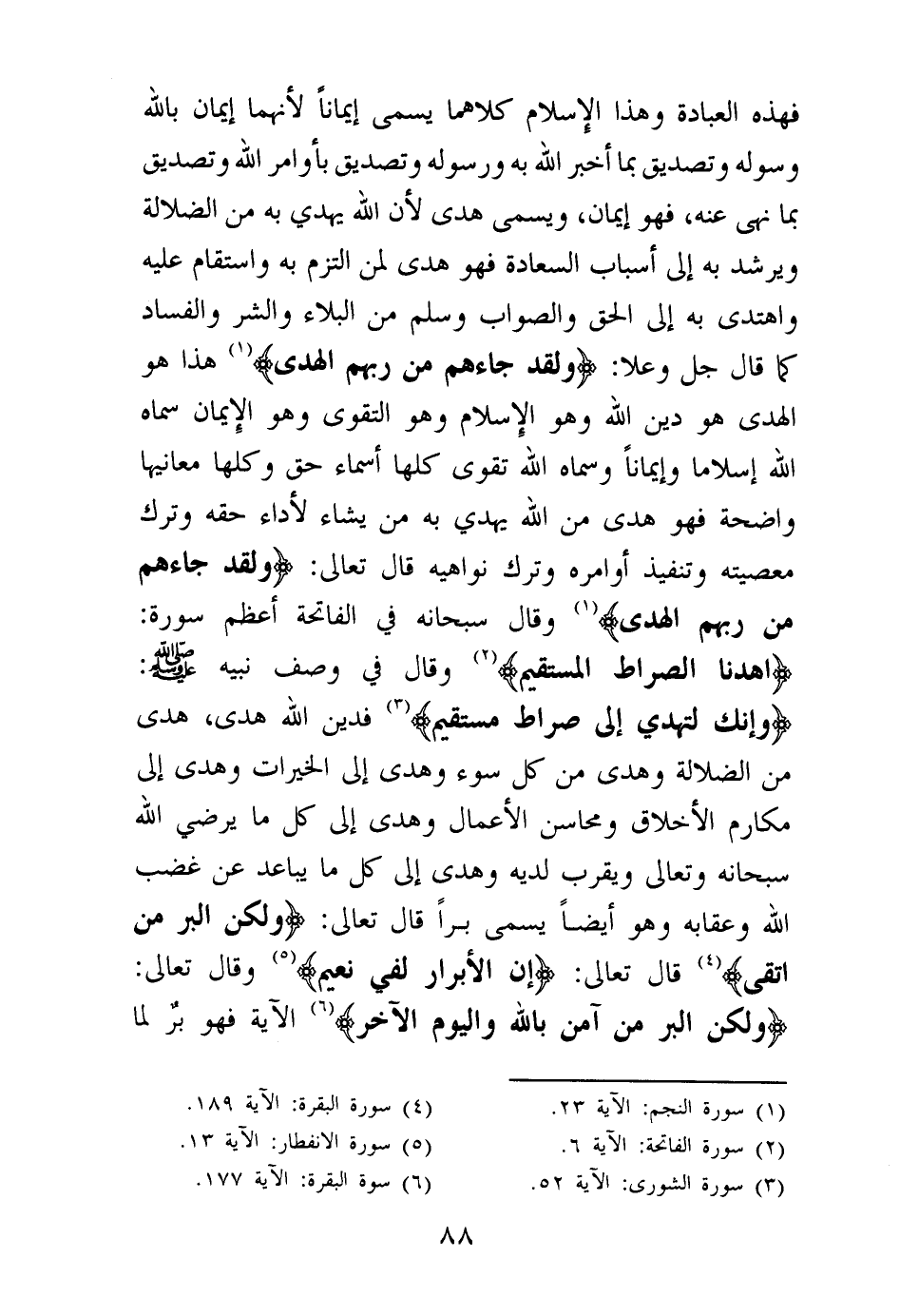 فدين الله هدى، هدى من الضلالة وهدى من كل سوء وهدى إلى الخيرات وهدى إلى مكارم الأخلاق ومحاسن الأعمال وهدى إلى كل ما يرضي الله سبحانه وتعالى ويقرب لديه وهدى إلى كل ما يباعد عن غضب الله وعقابه وهو أيضا يسمى برا قال تعالى: {وَلَكِنَّ الْبِرَّ مَنِ اتَّقَى} (¬5) قال تعالى: {إِنَّ الْأَبْرَارَ لَفِي نَعِيمٍ} (¬6) وقال تعالى: {وَلَكِنَّ الْبِرَّ مَنْ آمَنَ بِاللَّهِ وَالْيَوْمِ الْآخِرِ} (¬7) الآية فهو بر لما