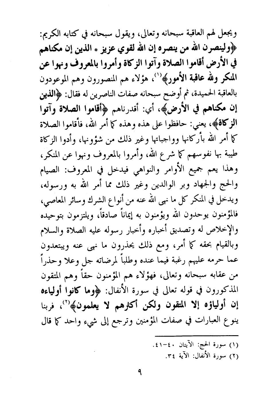 ثم أوضح سبحانه صفات الناصرين له فقال: {الَّذِينَ إِنْ مَكَّنَّاهُمْ فِي الْأَرْضِ} (¬3) أي: أقدرناهم {أَقَامُوا الصَّلَاةَ وَآتَوُا الزَّكَاةَ} (¬4) يعني: حافظوا على هذه وهذه كما أمر الله، فأقاموا الصلاة كما أمر الله بأركانها وواجباتها وغير ذلك من شئونها، وأدوا الزكاة طيبة بها نفوسهم كما شرع الله، وأمروا بالمعروف ونهوا عن المنكر، وهذا يعم جميع الأوامر والنواهي فيدخل في المعروف: الصيام والحج والجهاد وبر الوالدين وغير ذلك مما أمر الله به ورسوله، ويدخل في المنكر كل ما نهى الله عنه من أنواع الشرك وسائر المعاصي، فالمؤمنون يوحدون الله ويؤمنون به إيمانا صادقا، ويلتزمون بتوحيده والإخلاص له وتصديق أخباره وأخبار رسوله عليه الصلاة والسلام وبالقيام بحقه كما أمر، ومع ذلك يحذرون ما نهى عنه ويبتعدون عما حرمه عليهم رغبة فيما عنده وطلبا لمرضاته جل وعلا وحذرا من عقابه سبحانه وتعالى، فهؤلاء هم المؤمنون حقا وهم المتقون المذكورون في قوله تعالى في سورة الأنفال: {وَمَا كَانُوا أَوْلِيَاءَهُ إِنْ أَوْلِيَاؤُهُ إِلَّا الْمُتَّقُونَ وَلَكِنَّ أَكْثَرَهُمْ لَا يَعْلَمُونَ} (¬5)