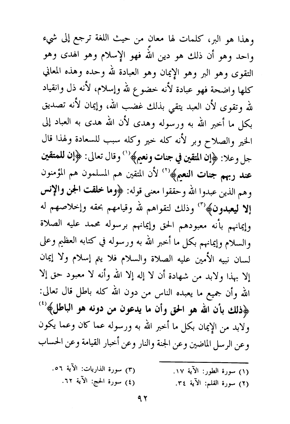 وهذا هو البر، كلمات لها معاني من حيث اللغة ترجع إلى شيء واحد وهو أن ذلك هو دين الله فهو الإسلام وهو الهدى وهو التقوى وهو البر وهو الإيمان وهو العبادة لله وحده وهذه المعاني كلها واضحة فهو عبادة لأنه خضوع لله وإسلام، لأنه ذل وانقياد لله وتقوى لأن العبد يتقي بذلك غضب الله، وإيمان لأنه تصديق بكل ما أخبر الله به ورسوله وهدى لأن الله هدى به العباد إلى الخير والصلاح وبر لأنه كله خير وكله سبب للسعادة ولهذا قال جل وعلا: {إِنَّ الْمُتَّقِينَ فِي جَنَّاتٍ وَنَعِيمٍ} (¬1) وقال تعالى: {إِنَّ لِلْمُتَّقِينَ عِنْدَ رَبِّهِمْ جَنَّاتِ النَّعِيمِ} (¬2) لأن المتقين هم المسلمون هم المؤمنون وهم الذين عبدوا الله وحققوا معنى قوله: {وَمَا خَلَقْتُ الْجِنَّ وَالْإِنْسَ إِلَّا لِيَعْبُدُونِ} (¬3)
