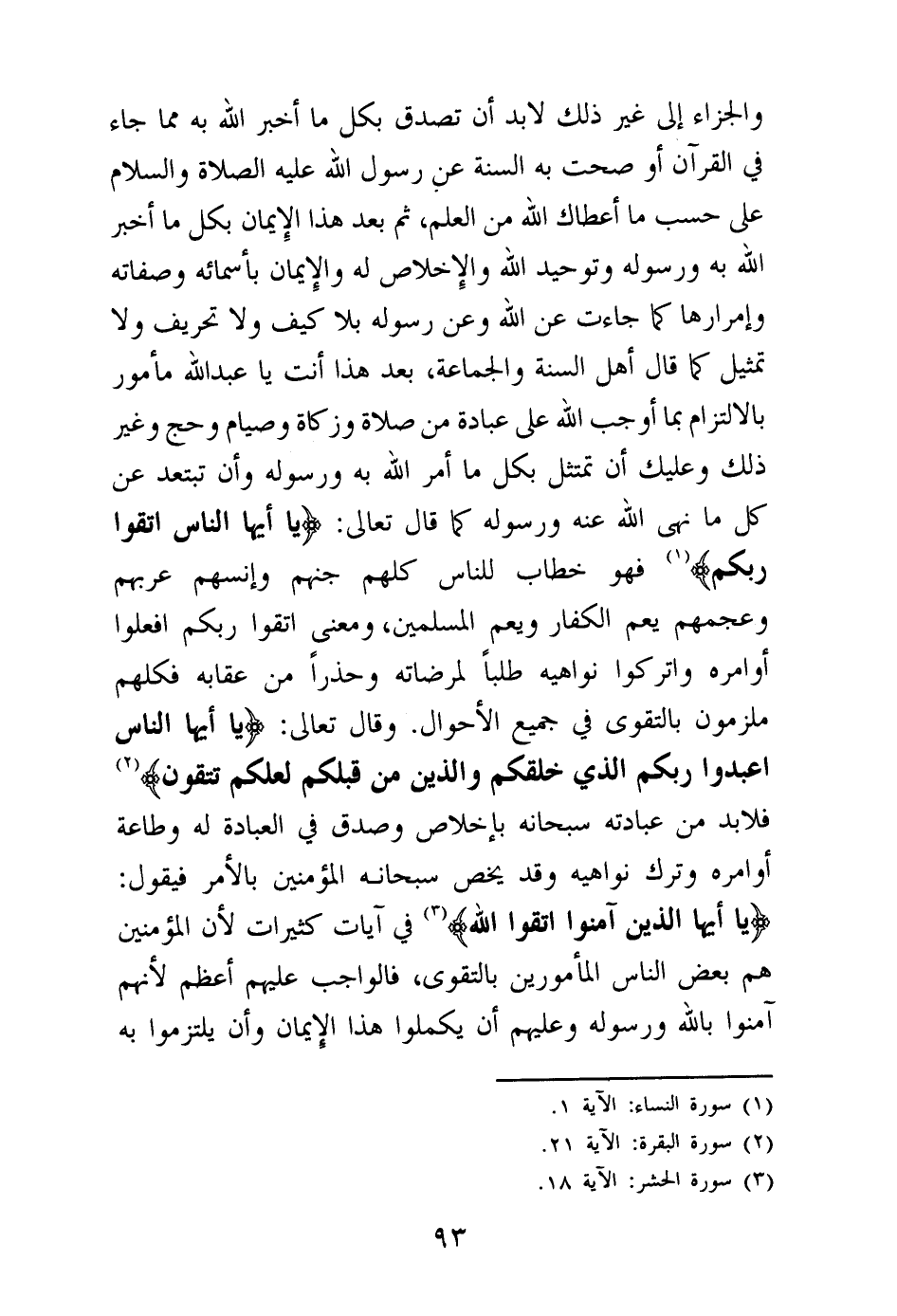 وقال تعالى: {يَا أَيُّهَا النَّاسُ اعْبُدُوا رَبَّكُمُ الَّذِي خَلَقَكُمْ وَالَّذِينَ مِنْ قَبْلِكُمْ لَعَلَّكُمْ تَتَّقُونَ} (¬2) فلا بد من عبادته سبحانه بإخلاص وصدق في العبادة له وطاعة أوامره وترك نواهيه وقد يخص سبحانه المؤمنين بالأمر فيقول: {يَا أَيُّهَا الَّذِينَ آمَنُوا اتَّقُوا اللَّهَ} (¬3) في آيات كثيرات لأن المؤمنين هم بعض الناس المأمورين بالتقوى، فالواجب عليهم أعظم لأنهم آمنوا بالله ورسوله وعليهم أن يكملوا هذا الإيمان وأن يلتزموا به