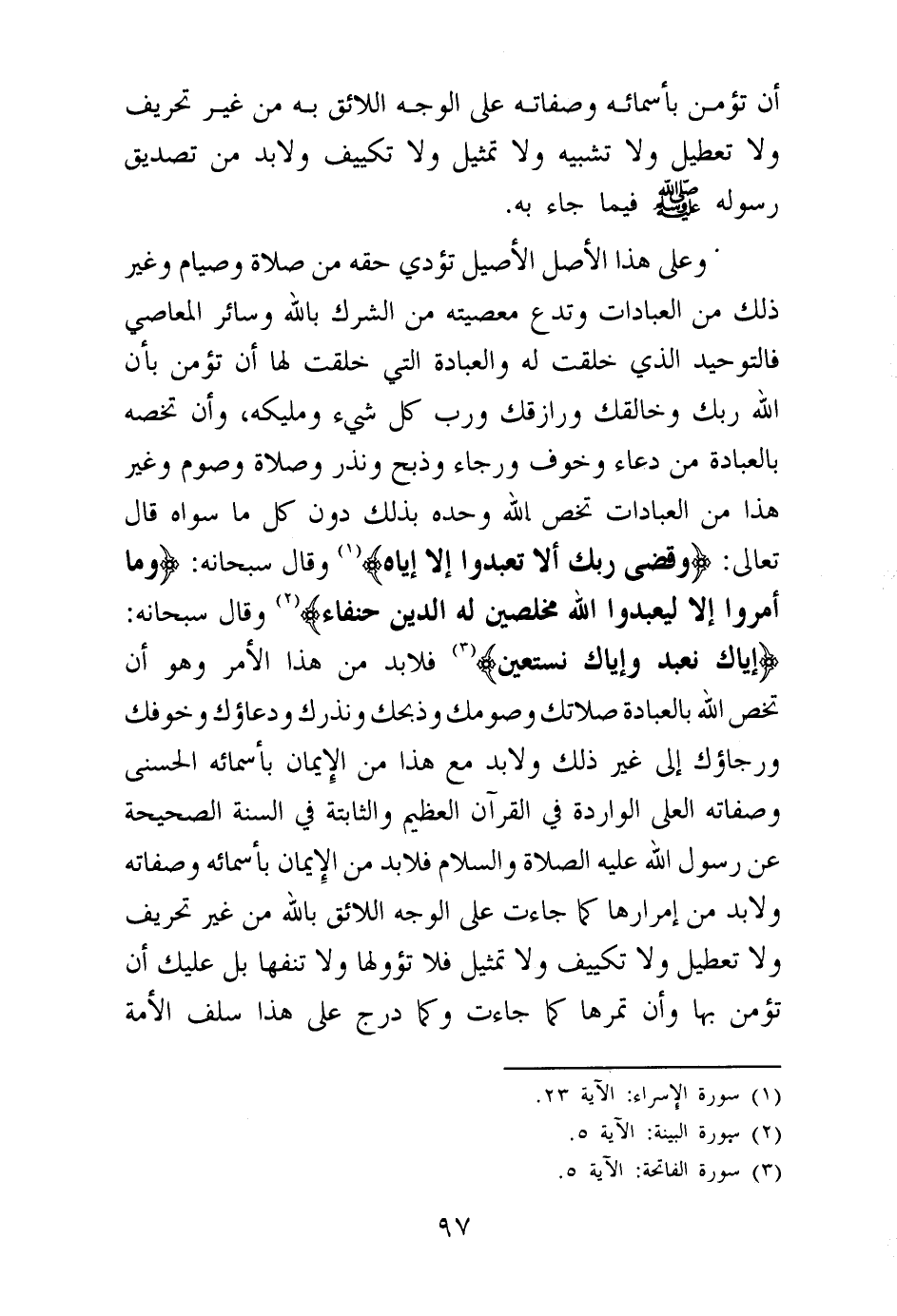 فلا بد من هذا الأمر وهو أن تخص الله بالعبادة صلاتك وصومك وذبحك ونذرك ودعائك وخوفك ورجاؤك إلى غير ذلك ولا بد مع هذا من الإيمان بأسمائه الحسنى وصفاته العلى الواردة في القرآن العظيم والثابتة في السنة الصحيحة عن رسول الله عليه الصلاة والسلام فلا بد من الإيمان بأسمائه وصفاته ولا بد من إمرارها كما جاءت على الوجه اللائق بالله من غير تحريف ولا تعطيل ولا تكييف ولا تمثيل فلا تؤولها ولا تنفها بل عليك أن تؤمن بها وأن تمرها كما جاءت وكما درج على هذا سلف الأمة