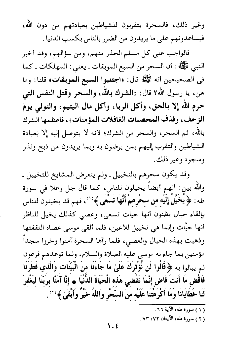 وقد يكون سحرهم بالتخييل - ولم يتعرض المشايخ للتخييل - والله بين: أنهم أيضا يخيلون للناس، كما قال جل وعلا في سورة طه: {يُخَيَّلُ إِلَيْهِ مِنْ سِحْرِهِمْ أَنَّهَا تَسْعَى} (¬2) فهم قد يخيلون للناس بإلقاء حبال يظنون أنها حيات تسعى، وعصي كذلك يخيل للناظر أنها حيات، وإنما هي تخييل للأعين، فلما ألقى موسى عصاه التقفتها وذهبت بهذه الحبال والعصي، فلما رآها السحرة آمنوا وخروا سجدا مؤمنين بما جاء به موسى عليه الصلاة والسلام، ولما توعدهم فرعون لم يبالوا به {قَالُوا لَنْ نُؤْثِرَكَ عَلَى مَا جَاءَنَا مِنَ الْبَيِّنَاتِ وَالَّذِي فَطَرَنَا فَاقْضِ مَا أَنْتَ قَاضٍ إِنَّمَا تَقْضِي هَذِهِ الْحَيَاةَ الدُّنْيَا} (¬3) {إِنَّا آمَنَّا بِرَبِّنَا لِيَغْفِرَ لَنَا خَطَايَانَا وَمَا أَكْرَهْتَنَا عَلَيْهِ مِنَ السِّحْرِ وَاللَّهُ خَيْرٌ وَأَبْقَى} (¬4)