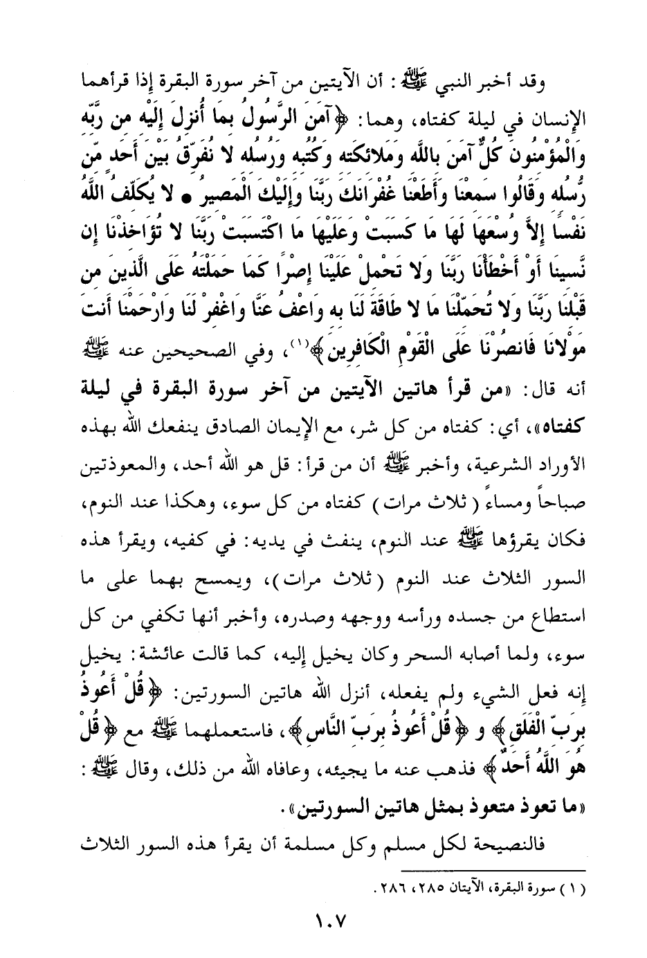 وفي الصحيحين عنه صلى الله عليه وسلم أنه قال: «من قرأ هاتين الآيتين من آخر سورة البقرة في ليلة كفتاه (¬3) » أي: كفتاه من كل شر، مع الإيمان الصادق ينفعك الله بهذه الأوراد الشرعية، وأخبر صلى الله عليه وسلم أن من قرأ: قل هو الله أحد، والمعوذتين صباحا ومساء (ثلاث مرات) كفتاه من كل سوء، وهكذا عند النوم، فكان يقرؤها صلى الله عليه وسلم عند النوم، ينفث في يديه: في كفيه، ويقرأ هذه السور الثلاث عند النوم (ثلاث مرات) ، ويمسح بهما على ما استطاع من جسده ورأسه ووجهه وصدره، وأخبر أنها تكفي من كل سوء، ولما أصابه السحر وكان يخيل إليه، كما قالت عائشة: يخيل إنه فعل الشيء ولم يفعله، أنزل الله هاتين السورتين: {قُلْ أَعُوذُ بِرَبِّ الْفَلَقِ} (¬4) و {قُلْ أَعُوذُ بِرَبِّ النَّاسِ} (¬5) فاستعملهما صلى الله عليه وسلم مع {قُلْ هُوَ اللَّهُ أَحَدٌ} (¬6) فذهب عنه ما يجيئه، وعافاه الله من ذلك، وقال صلى الله عليه وسلم: «ما تعوذ متعوذ بمثل هاتين السورتين (¬7) » .