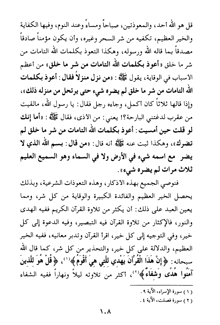 قل هو الله أحد، والمعوذتين، صباحا ومساء وعند النوم، وفيها الكفاية والخير العظيم، تكفيه من شر السحر وغيره، وأن يكون مؤمنا صادقا مصدقا بما قاله الله ورسوله، وهكذا التعوذ بكلمات الله التامات من شر ما خلق أعوذ بكلمات الله التامات من شر ما خلق من أعظم الأسباب في الوقاية، يقول صلى الله عليه وسلم: «من نزل منزلا فقال: أعوذ بكلمات الله التامات من شر ما خلق لم يضره شيء حتى يرتحل من منزله ذلك (¬1) » ، وإذا قالها ثلاثا كان أكمل، وجاءه رجل فقال: «يا رسول الله، ما لقيت من عقرب لدغتني البارحة؟ يعني: من الأذى، فقال صلى الله عليه وسلم: أما إنك لو قلت حين أمسيت: أعوذ بكلمات الله التامات من شر ما خلق لم تضرك (¬2) » .