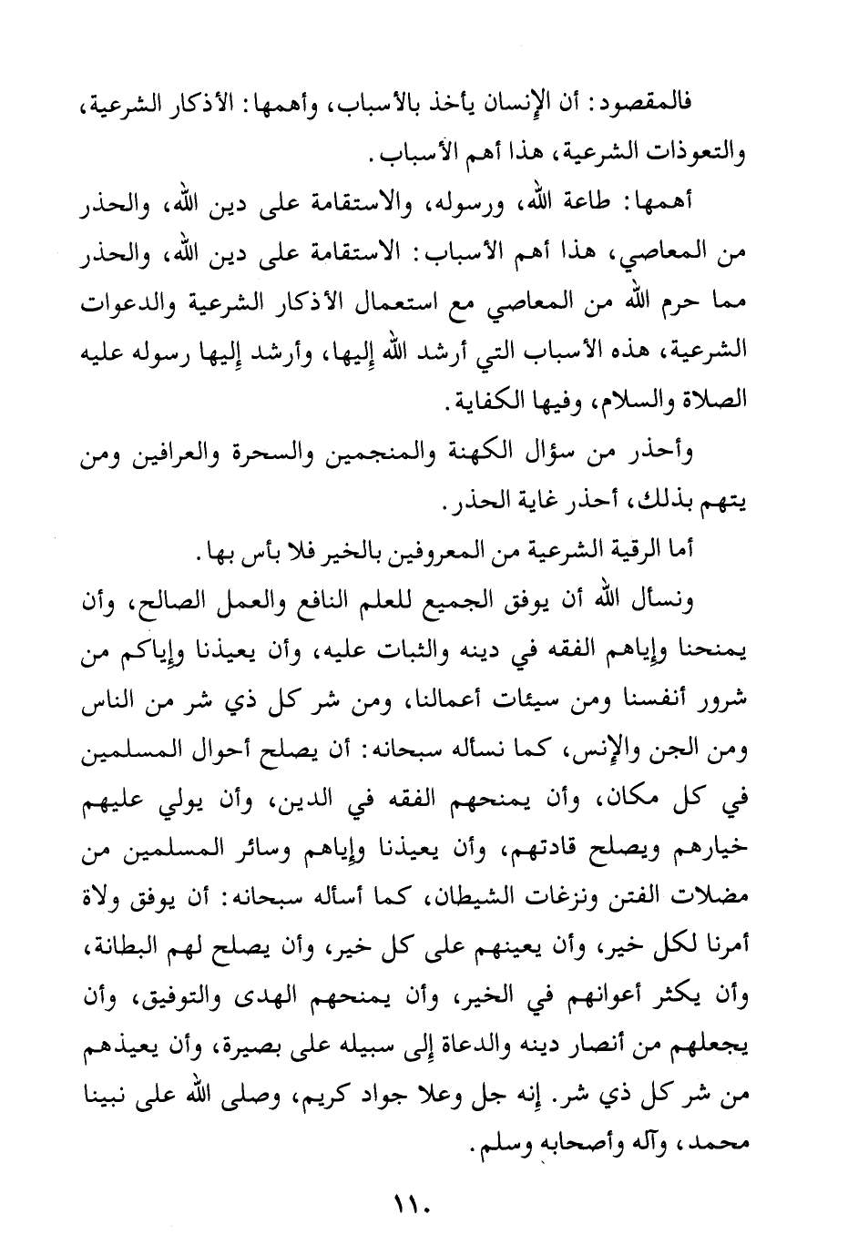 ونسأل الله أن يوفق الجميع للعلم النافع والعمل الصالح، وأن يمنحنا وإياهم الفقه في دينه والثبات عليه، وأن يعيذنا وإياكم من شرور أنفسنا ومن سيئات أعمالنا، ومن شر كل ذي شر من الناس ومن الجن والإنس، كما نسأله سبحانه: أن يصلح أحوال المسلمين في كل مكان، وأن يمنحهم الفقه في الدين، وأن يولي عليهم خيارهم ويصلح قادتهم، وأن يعيذنا وإياهم وسائر المسلمين من مضلات الفتن ونزغات الشيطان، كما أسأله سبحانه: أن يوفق ولاة أمرنا لكل خير، وأن يعينهم على كل خير، وأن يصلح لهم البطانة، وأن يكثر أعوانهم في الخير، وأن يمنحهم الهدى والتوفيق، وأن يجعلهم من أنصار دينه والدعاة إلى سبيله على بصيرة، وأن يعيذهم من شر كل ذي شر، إنه جل وعلا جواد كريم، وصلى الله على نبينا محمد، وآله وأصحابه وسلم.