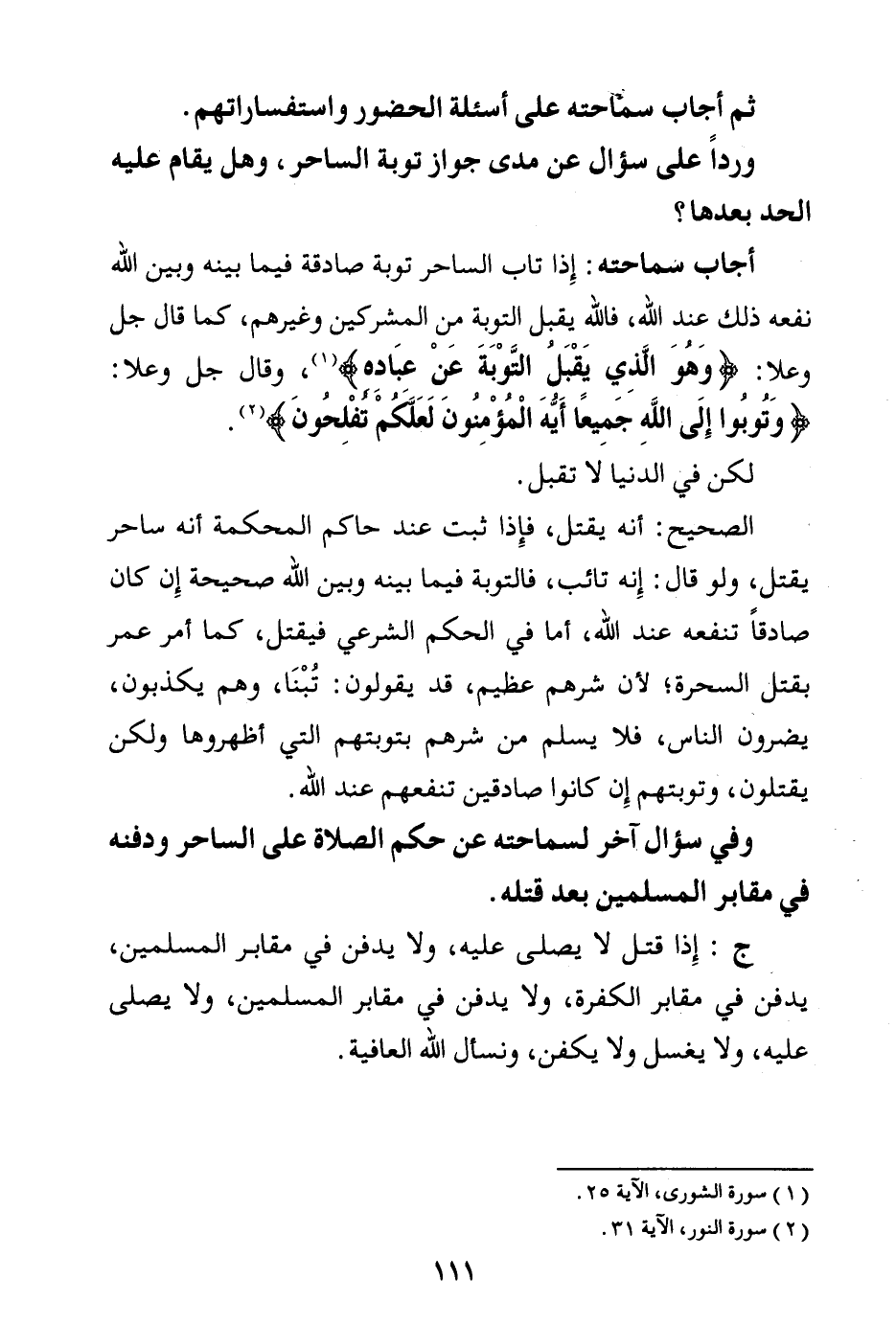 أجاب سماحته: إذا تاب الساحر توبة صادقة فيما بينه وبين الله نفعه ذلك عند الله، فالله يقبل التوبة من المشركين وغيرهم، كما قال جل وعلا: {وَهُوَ الَّذِي يَقْبَلُ التَّوْبَةَ عَنْ عِبَادِهِ} (¬1) وقال جل وعلا: {وَتُوبُوا إِلَى اللَّهِ جَمِيعًا أَيُّهَ الْمُؤْمِنُونَ لَعَلَّكُمْ تُفْلِحُونَ} (¬2) لكن في الدنيا لا تقبل.
