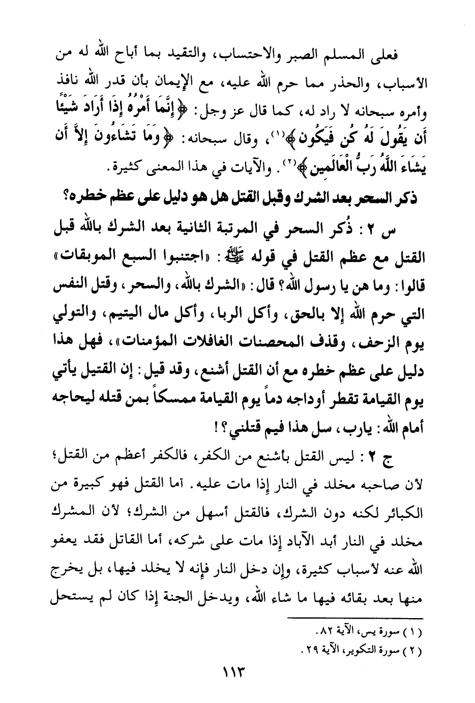 س 2: ذكر السحر في المرتبة الثانية بعد الشرك بالله قبل القتل مع عظم القتل في قوله صلى الله عليه وسلم: «اجتنبوا السبع الموبقات. قالوا: وما هن يا رسول الله؟ قال: الشرك بالله، والسحر، وقتل النفس التي حرم الله إلا بالحق، وأكل الربا، وأكل مال اليتيم، والتولي يوم الزحف، وقذف المحصنات الغافلات المؤمنات (¬1) » . فهل هذا دليل على عظم خطره مع أن القتل أشنع، وقد قيل: «إن القتيل يأتي يوم القيامة تقطر أوداجه دما يوم القيامة ممسكا بمن قتله ليحاجه أمام الله: يا رب، سل هذا: فيم قتلني؟ (¬2) » .