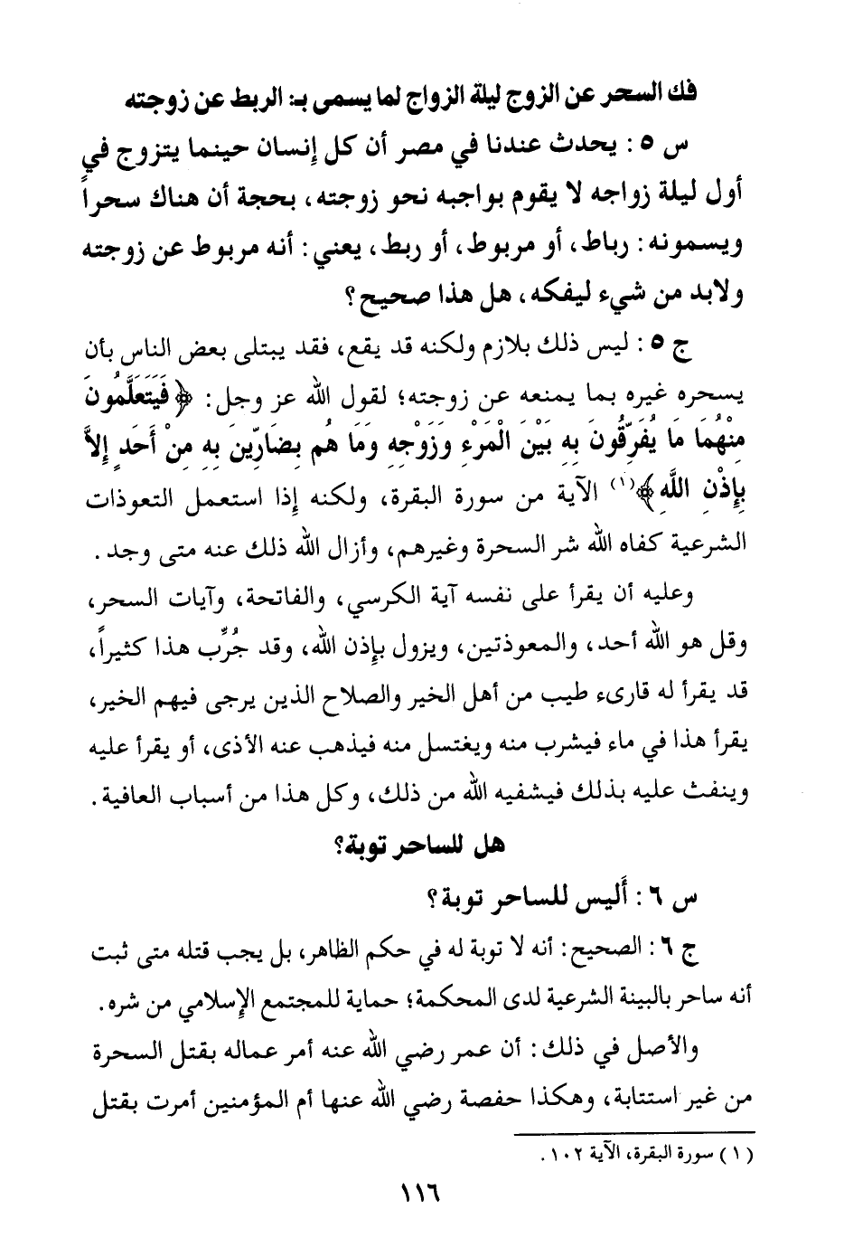 س 5: يحدث عندنا في مصر أن كل إنسان حينما يتزوج في أول ليلة زواجه لا يقوم بواجبه نحو زوجته، بحجة أن هناك سحرا ويسمونه: رباط، أو مربوط، أو ربط، يعني: أنه مربوط عن زوجته ولا بد من شيء ليفكه، هل هذا صحيح؟