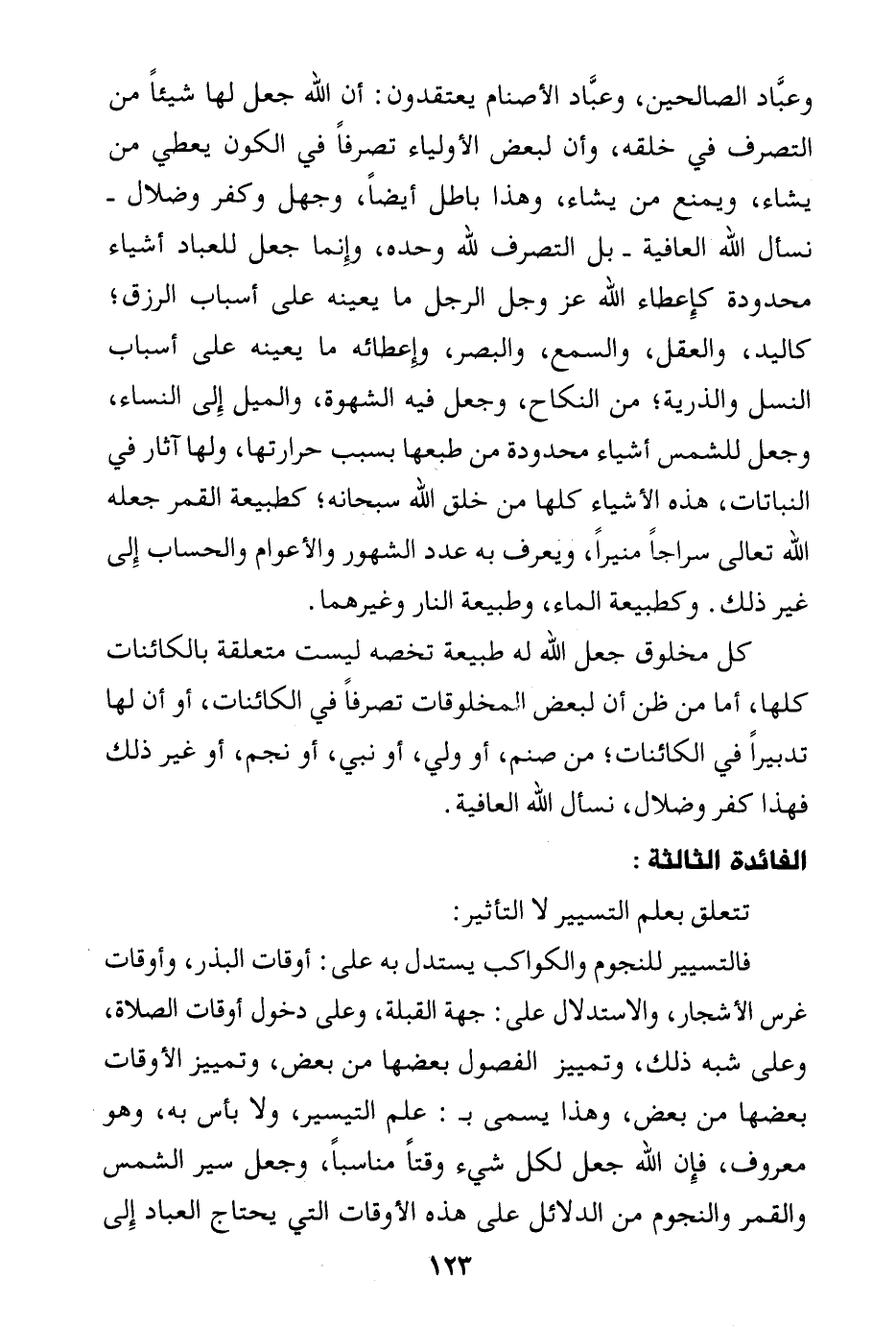 وعباد الصالحين، وعباد الأصنام يعتقدون: أن الله جعل لها شيئا من التصرف في خلقه، وأن لبعض الأولياء تصرفا في الكون يعطي من يشاء، ويمنع من يشاء، وهذا باطل أيضا، وجهل وكفر وضلال - نسأل الله العافية - بل التصرف لله وحده، وإنما جعل للعباد أشياء محدودة كإعطاء الله عز وجل الرجل ما يعينه على أسباب الرزق؛ كاليد، والعقل، والسمع، والبصر، وإعطائه ما يعينه على أسباب النسل والذرية؛ من النكاح، وجعل فيه الشهوة، والميل إلى النساء، وجعل للشمس أشياء محدودة من طبعها بسبب حرارتها، ولها آثار في النباتات، هذه الأشياء كلها من خلق الله سبحانه؛ كطبيعة القمر جعله الله تعالى سراجا منيرا، ويعرف به عدد الشهور والأعوام والحساب إلى غير ذلك، وكطبيعة الماء، وطبيعة النار وغيرهما.