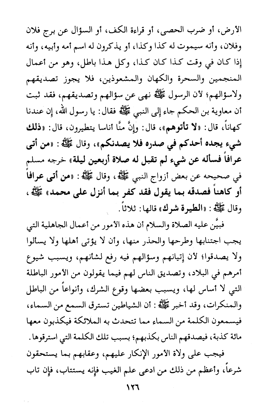 فبين عليه الصلاة والسلام أن هذه الأمور من أعمال الجاهلية التي يجب اجتنابها وطرحها والحذر منها، وأن لا يؤتى أهلها ولا يسألوا ولا يصدقوا؛ لأن إتيانهم وسؤالهم فيه رفع لشأنهم، ويسبب شيوع أمرهم في البلاد، وتصديق الناس لهم فيما يقولون من الأمور الباطلة التي لا أساس لها، ويسبب بعضها وقوع الشرك، وأنواعا من الباطل والمنكرات، وقد أخبر صلى الله عليه وسلم: أن الشياطين تسترق السمع من السماء، فيسمعون الكلمة من السماء مما تتحدث به الملائكة فيكذبون معها مائة كذبة، فيصدقهم الناس بكذبهم؛ بسبب تلك الكلمة التي استرقوها.