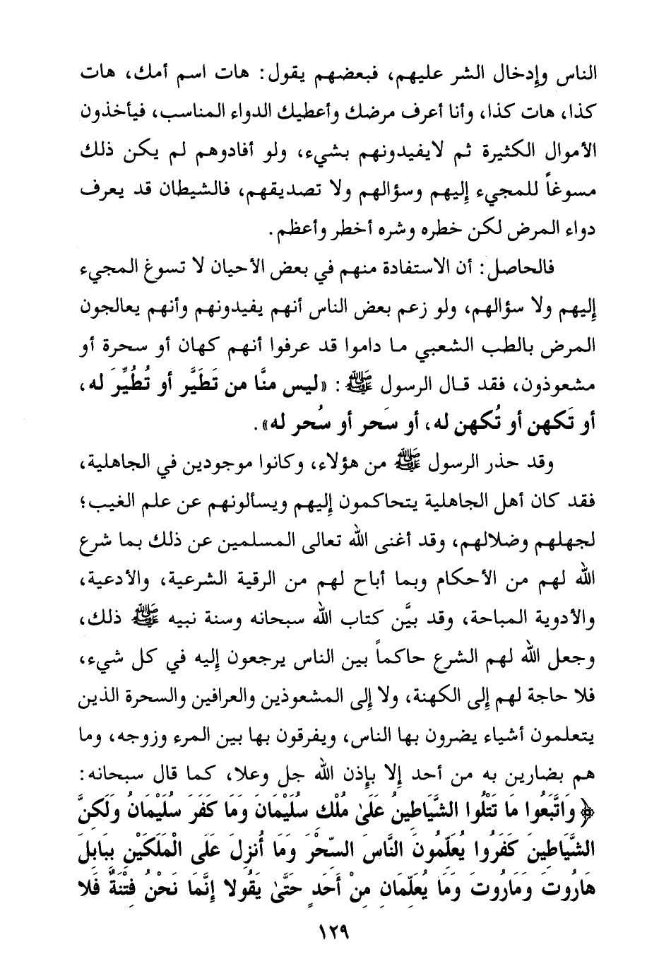 وقد حذر الرسول صلى الله عليه وسلم من هؤلاء، وكانوا موجودين في الجاهلية، فقد كان أهل الجاهلية يتحاكمون إليهم ويسألونهم عن علم الغيب؛ لجهلهم وضلالهم، وقد أغنى الله تعالى المسلمين عن ذلك بما شرع الله لهم من الأحكام وبما أباح لهم من الرقية الشرعية، والأدعية، والأدوية المباحة، وقد بين كتاب الله سبحانه وسنة نبيه صلى الله عليه وسلم ذلك، وجعل الله لهم الشرع حاكما بين الناس يرجعون إليه في كل شيء، فلا حاجة لهم إلى الكهنة، ولا إلى المشعوذين والعرافين والسحرة الذين يتعلمون أشياء يضرون بها الناس، ويفرقون بها بين المرء وزوجه، وما هم بضارين به من أحد إلا بإذن الله جل وعلا، كما قال سبحانه: {وَاتَّبَعُوا مَا تَتْلُو الشَّيَاطِينُ عَلَى مُلْكِ سُلَيْمَانَ وَمَا كَفَرَ سُلَيْمَانُ وَلَكِنَّ الشَّيَاطِينَ كَفَرُوا يُعَلِّمُونَ النَّاسَ السِّحْرَ وَمَا أُنْزِلَ عَلَى الْمَلَكَيْنِ بِبَابِلَ هَارُوتَ وَمَارُوتَ وَمَا يُعَلِّمَانِ مِنْ أَحَدٍ حَتَّى يَقُولَا إِنَّمَا نَحْنُ فِتْنَةٌ فَلَا تَكْفُرْ فَيَتَعَلَّمُونَ مِنْهُمَا مَا يُفَرِّقُونَ بِهِ بَيْنَ الْمَرْءِ وَزَوْجِهِ وَمَا هُمْ بِضَارِّينَ بِهِ مِنْ أَحَدٍ إِلَّا بِإِذْنِ اللَّهِ} (¬1)