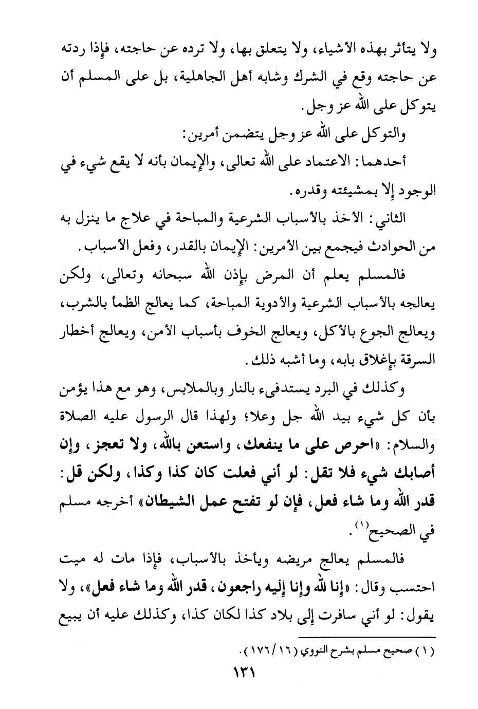 وكذلك في البرد يستدفئ بالنار وبالملابس، وهو مع هذا يؤمن بأن كل شيء بيد الله جل وعلا؛ ولهذا قال الرسول عليه الصلاة والسلام: «احرص على ما ينفعك، واستعن بالله ولا تعجز، وإن أصابك شيء فلا تقل: لو أني فعلت كان كذا وكذا، ولكن قل: قدر الله وما شاء فعل، فإن لو تفتح عمل الشيطان (¬1) » أخرجه مسلم في الصحيح (¬2) .