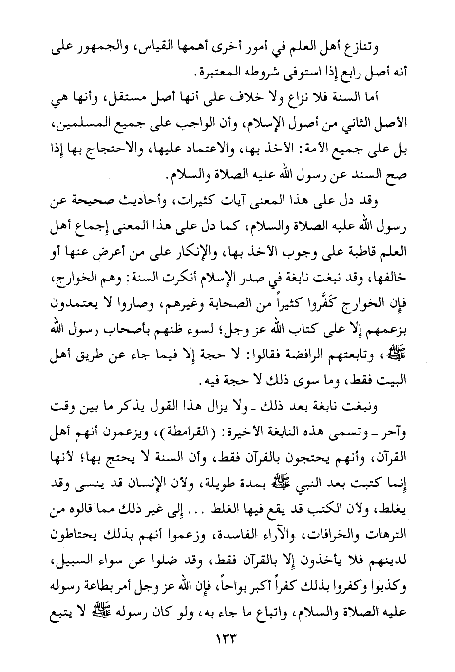 وقد دل على هذا المعنى آيات كثيرات، وأحاديث صحيحة عن رسول الله عليه الصلاة والسلام، كما دل على هذا المعنى إجماع أهل العلم قاطبة على وجوب الأخذ بها، والإنكار على من أعرض عنها أو خالفها، وقد نبغت نابغة في صدر الإسلام أنكرت السنة: وهم الخوارج، فإن الخوارج كفروا كثيرا من الصحابة وغيرهم، وصاروا لا يعتمدون بزعمهم إلا على كتاب الله عز وجل؛ لسوء ظنهم بأصحاب رسول الله صلى الله عليه وسلم، وتابعتهم الرافضة فقالوا: لا حجة إلا فيما جاء عن طريق أهل البيت فقط، وما سوى ذلك لا حجة فيه.