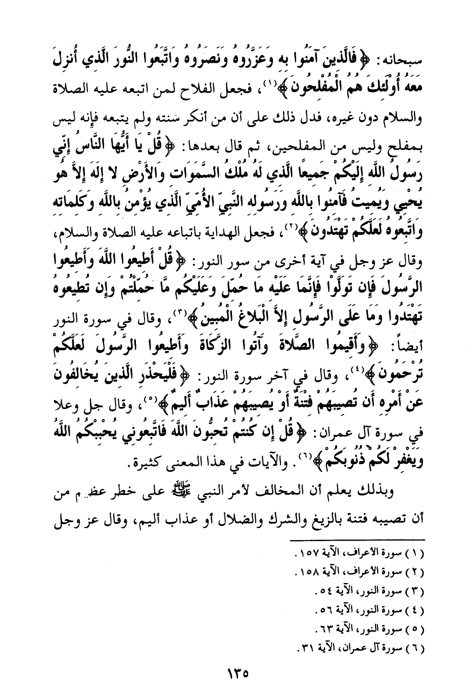 سبحانه: {فَالَّذِينَ آمَنُوا بِهِ وَعَزَّرُوهُ وَنَصَرُوهُ وَاتَّبَعُوا النُّورَ الَّذِي أُنْزِلَ مَعَهُ أُولَئِكَ هُمُ الْمُفْلِحُونَ} (¬1) فجعل الفلاح لمن اتبعه عليه الصلاة والسلام دون غيره، فدل ذلك على أن من أنكر سنته ولم يتبعه فإنه ليس بمفلح وليس من المفلحين، ثم قال بعدها: {قُلْ يَا أَيُّهَا النَّاسُ إِنِّي رَسُولُ اللَّهِ إِلَيْكُمْ جَمِيعًا الَّذِي لَهُ مُلْكُ السَّمَاوَاتِ وَالْأَرْضِ لَا إِلَهَ إِلَّا هُوَ يُحْيِي وَيُمِيتُ فَآمِنُوا بِاللَّهِ وَرَسُولِهِ النَّبِيِّ الْأُمِّيِّ الَّذِي يُؤْمِنُ بِاللَّهِ وَكَلِمَاتِهِ وَاتَّبِعُوهُ لَعَلَّكُمْ تَهْتَدُونَ} (¬2) فجعل الهداية باتباعه عليه الصلاة والسلام، وقال عز وجل في آية أخرى من سورة النور: {قُلْ أَطِيعُوا اللَّهَ وَأَطِيعُوا الرَّسُولَ فَإِنْ تَوَلَّوْا فَإِنَّمَا عَلَيْهِ مَا حُمِّلَ وَعَلَيْكُمْ مَا حُمِّلْتُمْ وَإِنْ تُطِيعُوهُ تَهْتَدُوا وَمَا عَلَى الرَّسُولِ إِلَّا الْبَلَاغُ الْمُبِينُ} (¬3) وقال في سورة النور أيضا: {وَأَقِيمُوا الصَّلَاةَ وَآتُوا الزَّكَاةَ وَأَطِيعُوا الرَّسُولَ لَعَلَّكُمْ تُرْحَمُونَ} (¬4) وقال في آخر سورة النور: {فَلْيَحْذَرِ الَّذِينَ يُخَالِفُونَ عَنْ أَمْرِهِ أَنْ تُصِيبَهُمْ فِتْنَةٌ أَوْ يُصِيبَهُمْ عَذَابٌ أَلِيمٌ} (¬5) وقال جل وعلا في سورة آل عمران: {قُلْ إِنْ كُنْتُمْ تُحِبُّونَ اللَّهَ فَاتَّبِعُونِي يُحْبِبْكُمُ اللَّهُ وَيَغْفِرْ لَكُمْ ذُنُوبَكُمْ} (¬6) والآيات في هذا المعنى كثيرة.