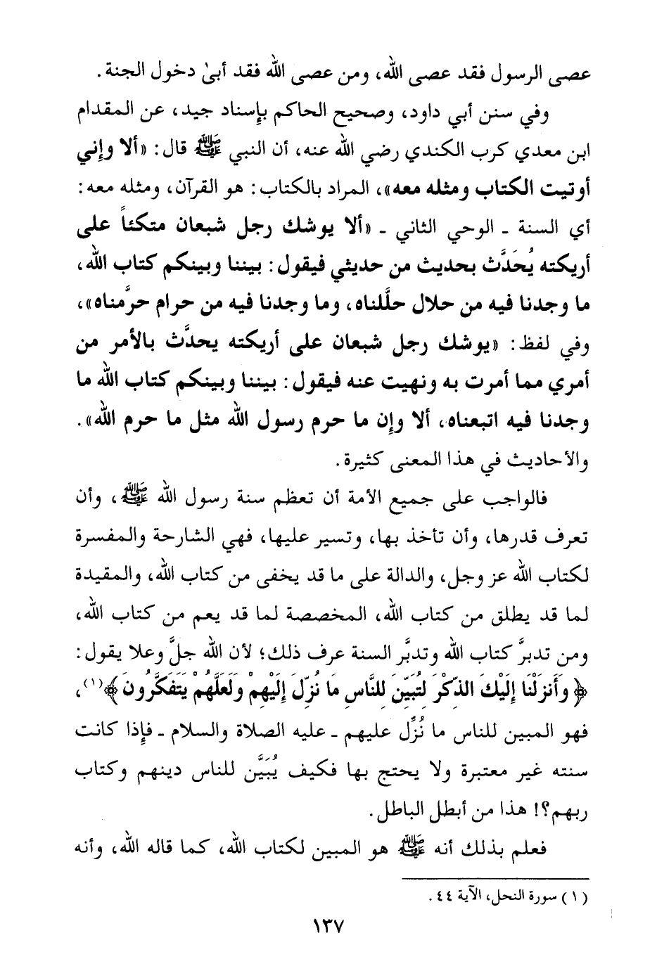 وفي سنن أبي داود، وصحيح الحاكم بإسناد جيد، عن المقدام بن معدي كرب الكندي رضي الله عنه، أن النبي صلى الله عليه وسلم قال: «ألا وإني أوتيت الكتاب ومثله معه (¬1) » . المراد بالكتاب: هو القرآن، ومثله معه: أي السنة - الوحي الثاني- «ألا يوشك رجل شبعان متكئا على أريكته يحدث بحديث من حديثي فيقول: بيننا وبينكم كتاب الله، ما وجدنا فيه من حلال حللناه، وما وجدنا فيه من حرام حرمناه (¬2) » . وفي لفظ: «يوشك رجل شبعان على أريكته يحدث بالأمر من أمري مما أمرت به ونهيت عنه، فيقول: بيننا وبينكم كتاب الله، ما وجدنا فيه اتبعناه، ألا وإن ما حرم رسول الله مثل ما حرم الله (¬3) » . والأحاديث في هذا المعنى كثيرة.
