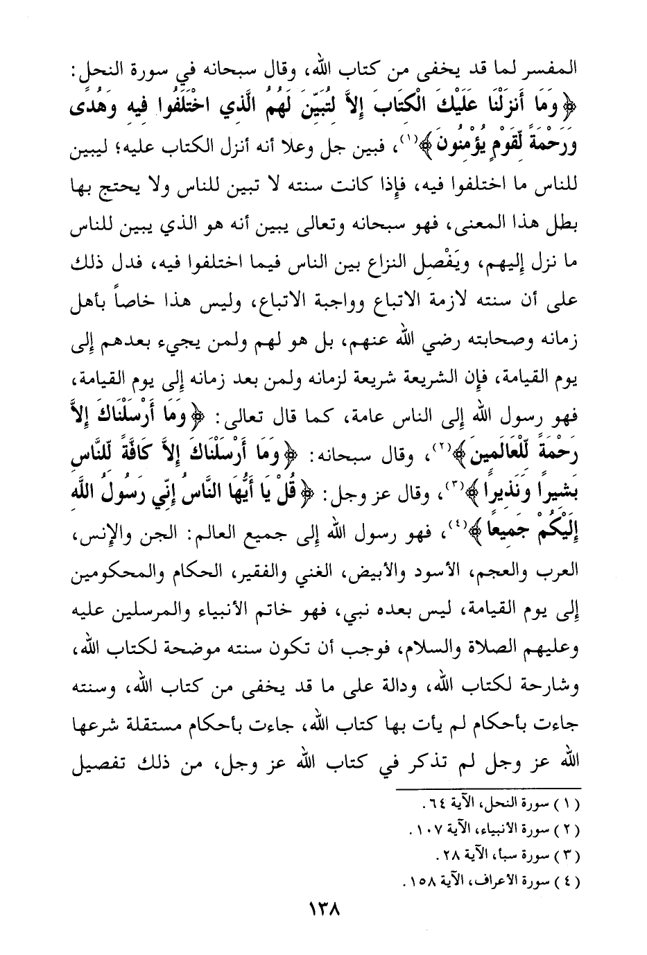 فهو رسول الله إلى جميع العالم: الجن والإنس، العرب والعجم، الأسود والأبيض، الغني والفقير، الحكام والمحكومين إلى يوم القيامة، ليس بعده نبي، فهو خاتم الأنبياء والمرسلين عليه وعليهم الصلاة والسلام، فوجب أن تكون سنته موضحة لكتاب الله، وشارحة لكتاب الله، ودالة على ما قد يخفى من كتاب الله، وسنته جاءت بأحكام لم يأت بها كتاب الله، جاءت بأحكام مستقلة شرعها الله عز وجل لم تذكر في كتاب الله عز وجل، من ذلك تفصيل