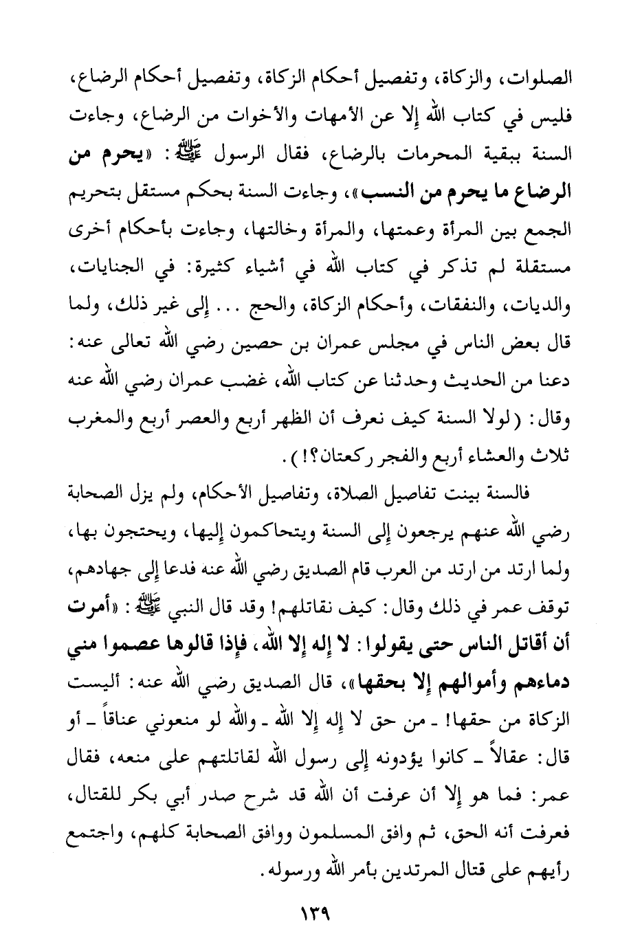 فالسنة بينت تفاصيل الصلاة، وتفاصيل الأحكام، ولم يزل الصحابة رضي الله عنهم يرجعون إلى السنة ويتحاكمون إليها، ويحتجون بها، ولما ارتد من ارتد من العرب قام الصديق رضي الله عنه فدعا إلى جهادهم، توقف عمر في ذلك وقال: كيف نقاتلهم وقد قال النبي صلى الله عليه وسلم: «أمرت أن أقاتل الناس حتى يقولوا: لا إله إلا الله، فإذا قالوها عصموا مني دماءهم وأموالهم إلا بحقها (¬2) » ؟! قال الصديق رضي الله عنه: أليست الزكاة من حقها- من حق لا إله إلا الله - والله لو منعوني عناقا - أو قال: عقالا - كانوا يؤدونه إلى رسول الله لقاتلتهم على منعه. فقال عمر: فما هو إلا أن عرفت أن الله قد شرح صدر أبي بكر للقتال فعرفت أنه الحق. ثم وافق المسلمون ووافق الصحابة كلهم، واجتمع رأيهم على قتال المرتدين بأمر الله ورسوله.