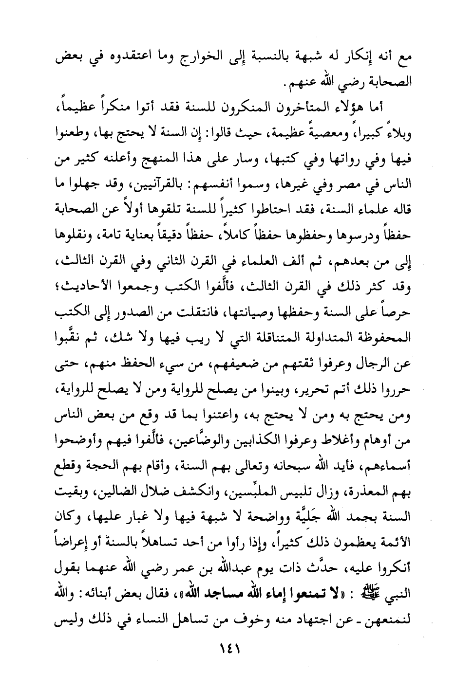 واعتنوا بما قد وقع من بعض الناس من أوهام وأغلاط وعرفوا الكذابين والوضاعين، فألفوا فيهم وأوضحوا أسماءهم، فأيد الله سبحانه وتعالى بهم السنة، وأقام بهم الحجة وقطع بهم المعذرة، وزال تلبيس الملبسين، وانكشف ضلال الضالين، وبقيت السنة بحمد الله جلية وواضحة لا شبهة فيها ولا غبار عليها، وكان الأئمة يعظمون ذلك كثيرا، وإذا رأوا من أحد تساهلا بالسنة أو إعراضا أنكروا عليه، حدث ذات يوم عبد الله بن عمر رضي الله عنهما بقول النبي صلى الله عليه وسلم: «لا تمنعوا إماء الله مساجد الله (¬1) » . فقال بعض أبنائه: والله لنمنعهن - عن اجتهاد منه وخوف من تساهل النساء في ذلك وليس