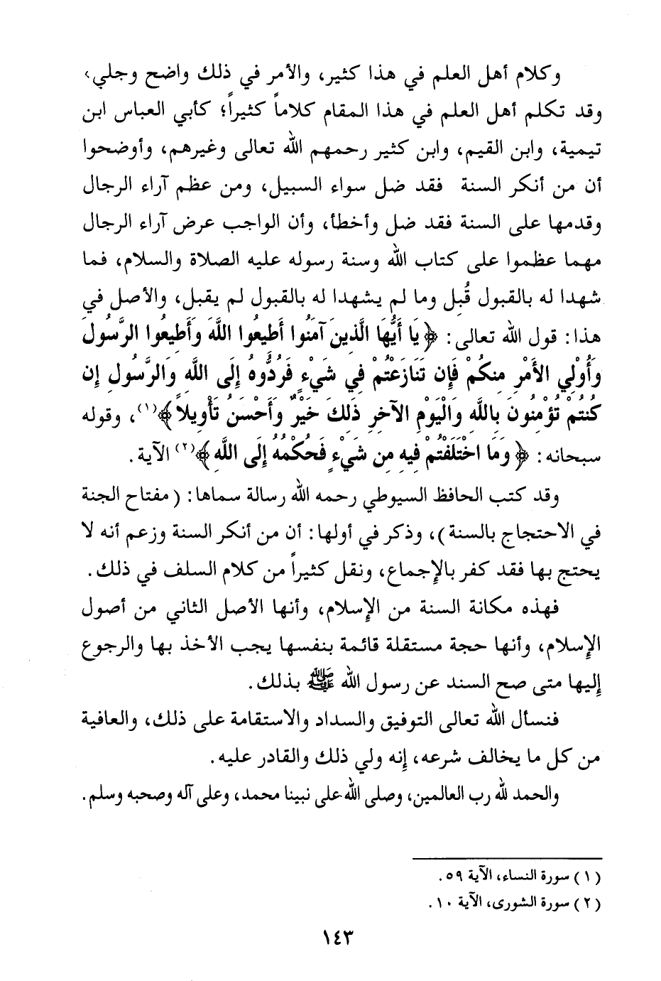 وقد كتب الحافظ السيوطي رحمه الله رسالة سماها: (مفتاح الجنة في الاحتجاح بالسنة) ، وذكر في أولها: أن من أنكر السنة وزعم أنه لا يحتج بها فقد كفر بالإجماع، ونقل كثيرا من كلام السلف في ذلك.