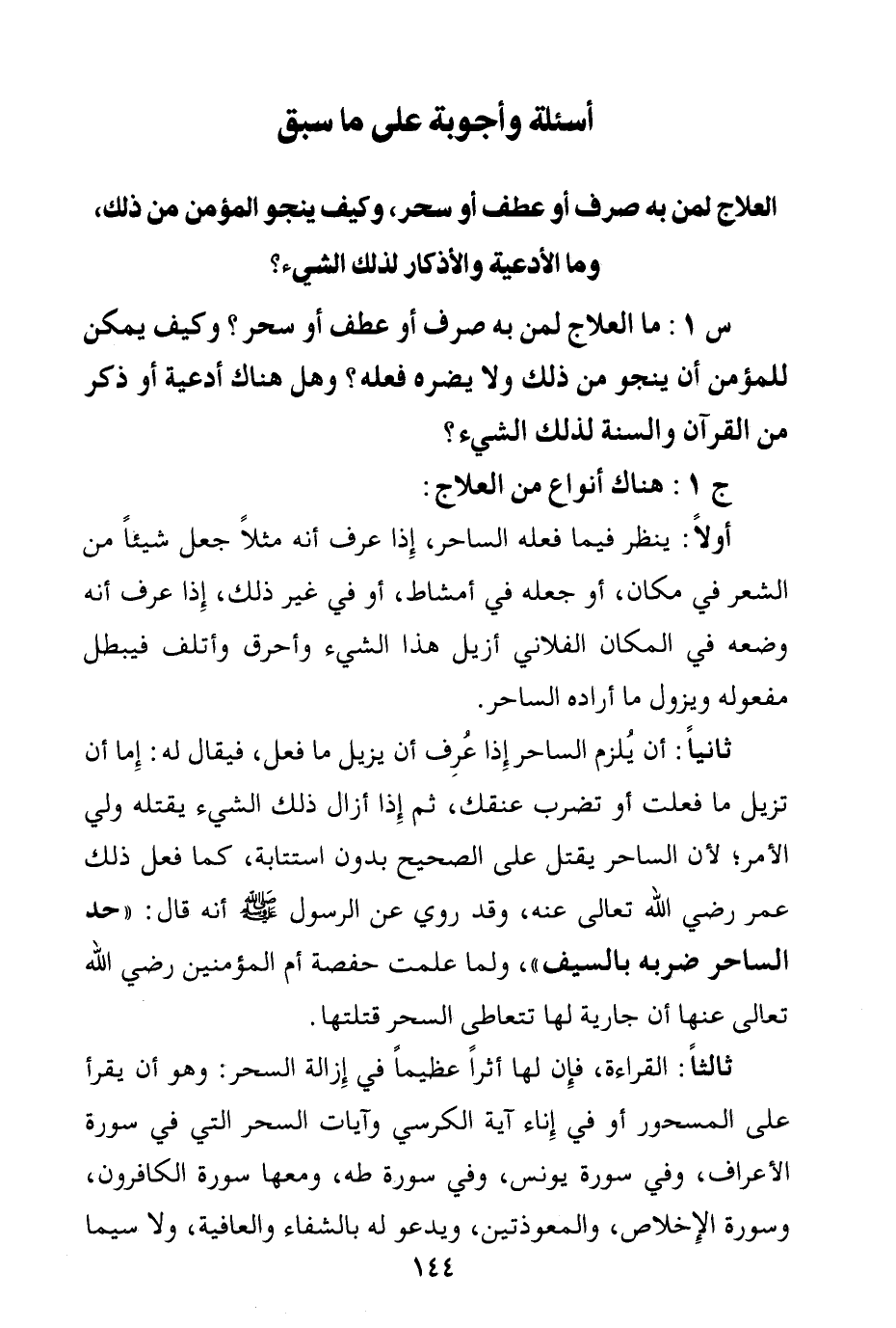 س 1: ما العلاج لمن به صرف أو عطف أو سحر؟ وكيف يمكن للمؤمن أن ينجو من ذلك ولا يضره فعله؟ وهل هناك أدعية أو ذكر من القرآن والسنة لذلك الشيء؟ .