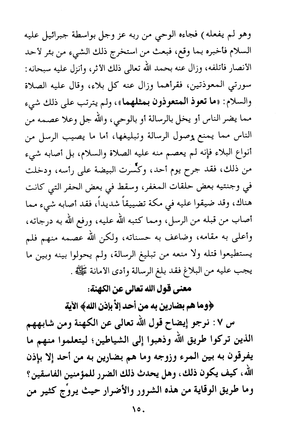 وهو لم يفعله» . فجاءه الوحي من ربه عز وجل بواسطة جبرائيل عليه السلام فأخبره بما وقع، فبعث من استخرج ذلك الشيء من بئر لأحد الأنصار فأتلفه، وزال عنه بحمد الله تعالى ذلك الأثر، وأنزل عليه سبحانه سورتي المعوذتين فقرأهما وزال عنه كل بلاء، وقال عليه الصلاة والسلام: «ما تعوذ المتعوذون بمثلهما (¬1) » ولم يترتب على ذلك شيء مما يضر الناس أو يخل بالرسالة أو بالوحي، والله جل وعلا عصمه من الناس مما يمنع وصول الرسالة وتبليغها.