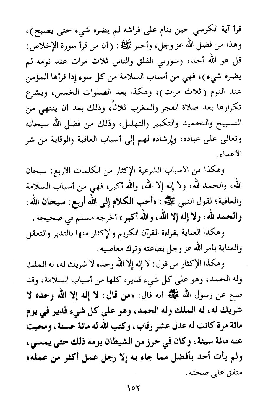 وهكذا الإكثار من قول: لا إله إلا الله وحده لا شريك له، له الملك وله الحمد، وهو على كل شيء قدير، كلها من أسباب السلامة، وقد صح عن رسول الله صلى الله عليه وسلم أنه قال: «من قال: لا إله إلا الله وحده لا شريك له، له الملك وله الحمد، وهو على كل شيء قدير، في يوم مائة مرة، كانت له عدل عشر رقاب، وكتب الله له مائة حسنة، ومحيت عنه مائة سيئة، وكان في حرز من الشيطان يومه ذلك حتى يمسي، ولم يأت أحد بأفضل مما جاء به إلا رجل عمل أكثر من عمله (¬4) » . متفق على صحته.