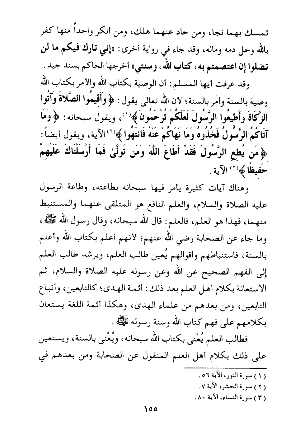 وقد عرفت أيها المسلم: أن الوصية بكتاب الله والأمر بكتاب الله وصية بالسنة وأمر بالسنة؛ لأن الله تعالى يقول: {وَأَقِيمُوا الصَّلَاةَ وَآتُوا الزَّكَاةَ وَأَطِيعُوا الرَّسُولَ لَعَلَّكُمْ تُرْحَمُونَ} (¬1) ويقول سبحانه: {وَمَا آتَاكُمُ الرَّسُولُ فَخُذُوهُ وَمَا نَهَاكُمْ عَنْهُ فَانْتَهُوا} (¬2) الآية، ويقول أيضا: {مَنْ يُطِعِ الرَّسُولَ فَقَدْ أَطَاعَ اللَّهَ وَمَنْ تَوَلَّى فَمَا أَرْسَلْنَاكَ عَلَيْهِمْ حَفِيظًا} (¬3) الآية. وهناك آيات كثيرة يأمر فيها سبحانه بطاعته، وطاعة الرسول عليه الصلاة والسلام، والعلم النافع هو المتلقى عنهما والمستنبط منهما، فهذا هو العلم، فالعلم: قال الله سبحانه، وقال رسول الله صلى الله عليه وسلم، وما جاء عن الصحابة رضي الله عنهم.