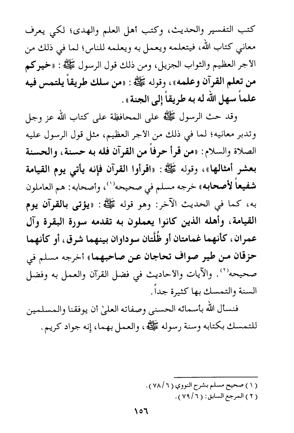 وقد حث الرسول صلى الله عليه وسلم على المحافظة على كتاب الله عز وجل وتدبر معانيه؛ لما في ذلك من الأجر العظيم، مثل قول الرسول عليه الصلاة والسلام: «من قرأ حرفا من القرآن فله به حسنة، والحسنة بعشر أمثالها (¬3) » ، وقوله صلى الله عليه وسلم: «اقرءوا القرآن فإنه يأتي يوم القيامة شفيعا لأصحابه» خرجه مسلم في صحيحه (¬4) ، وأصحابه: هم العاملون به، كما في الحديث الآخر: وهو قوله صلى الله عليه وسلم: «يؤتى بالقرآن يوم القيامة وأهله الذين كانوا يعملون به تقدمه سورة البقرة وآل عمران كأنهما غمامتان أو ظلتان سوداوان بينهما شرق أو كأنهما حزقان من طير صواف تحاجان عن صاحبهما» . أخرجه مسلم في صحيحه (¬5) . والآيات والأحاديث في فضل القرآن والعمل به وفضل السنة والتمسك بها كثيرة جدا.