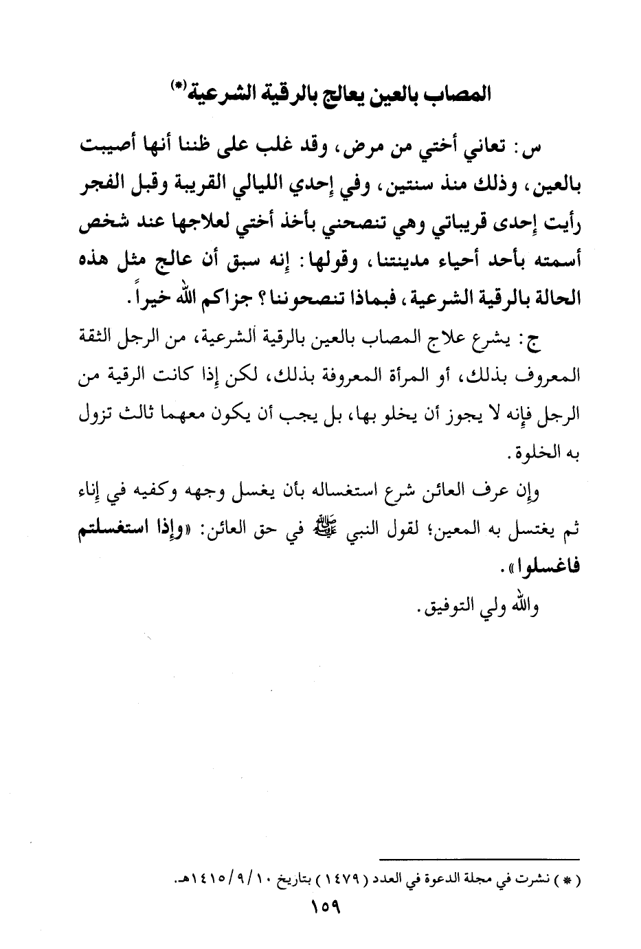 ج: يشرع علاج المصاب بالعين بالرقية الشرعية، من الرجل الثقة المعروف بذلك، أو المرأة المعروفة بذلك، لكن إذا كانت الرقية من الرجل فإنه لا يجوز أن يخلو بها، بل يجب أن يكون معهما ثالث تزول به الخلوة.