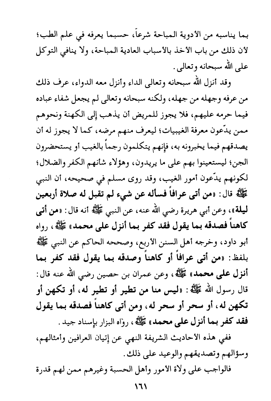 ففي هذه الأحاديث الشريفة النهي عن إتيان العرافين وأمثالهم، وسؤالهم وتصديقهم والوعيد على ذلك.