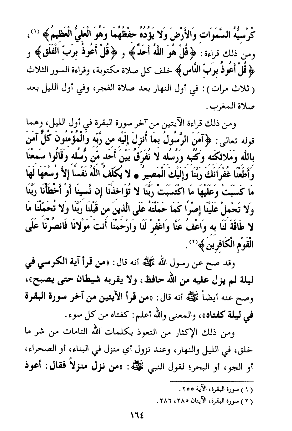 وقد صح عن رسول الله صلى الله عليه وسلم أنه قال: «من قرأ آية الكرسي في ليلة لم يزل عليه من الله حافظ، ولا يقربه شيطان حتى يصبح (¬6) » . وصح عنه أيضا صلى الله عليه وسلم أنه قال: «من قرأ الآيتين من آخر سورة البقرة في ليلة كفتاه (¬7) » . والمعنى والله أعلم: كفتاه من كل سوء.
