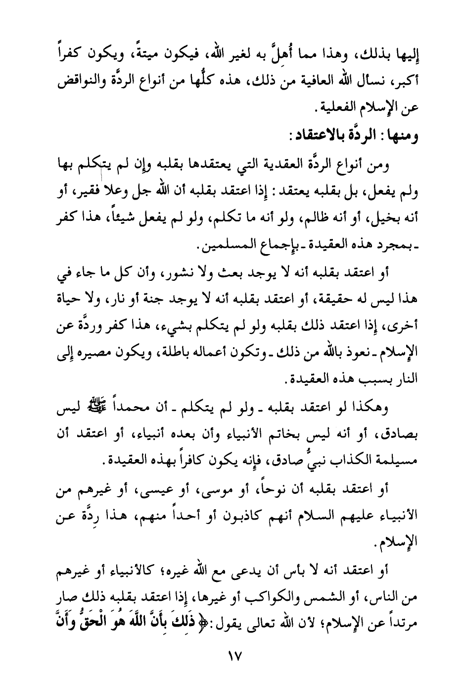 ومن أنواع الردة العقدية التي يعتقدها بقلبه وإن لم يتكلم بها ولم يفعل، بل بقلبه يعتقد: إذا اعتقد بقلبه أن الله جل وعلا فقير، أو أنه بخيل، أو أنه ظالم، ولو أنه ما تكلم، ولو لم يفعل شيئا، هذا كفر - بمجرد هذه العقيدة - بإجماع المسلمين.