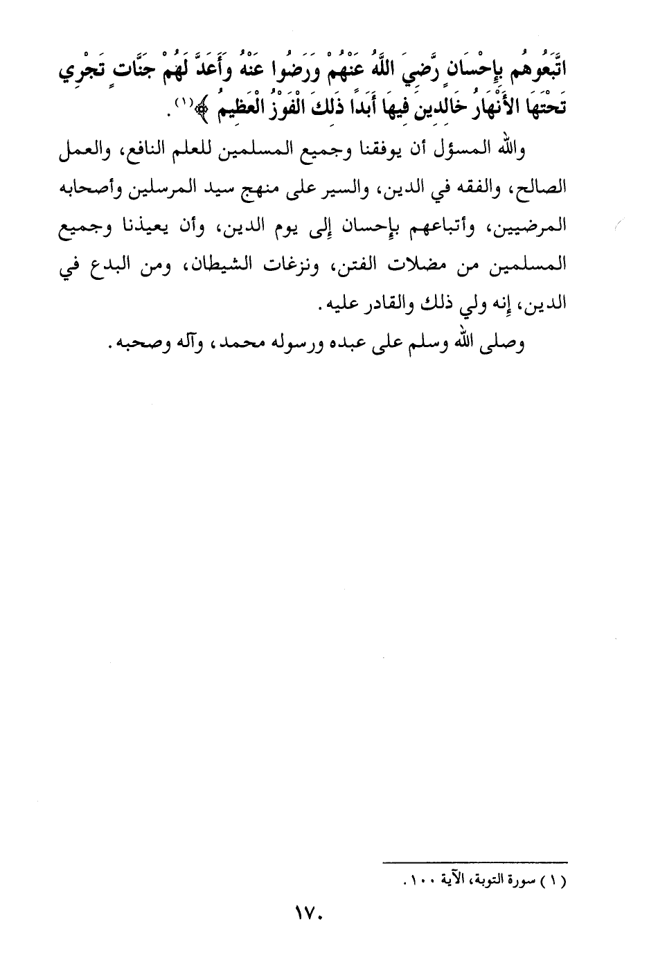 والله المسئول أن يوفقنا وجميع المسلمين للعلم النافع، والعمل الصالح، والفقه في الدين، والسير على منهج سيد المرسلين وأصحابه المرضيين، وأتباعهم بإحسان إلى يوم الدين، وأن يعيذنا وجميع المسلمين من مضلات الفتن، ونزغات الشيطان، ومن البدع في الدين، إنه ولي ذلك والقادر عليه. وصلى الله وسلم على عبده ورسوله محمد، وآله وصحبه.