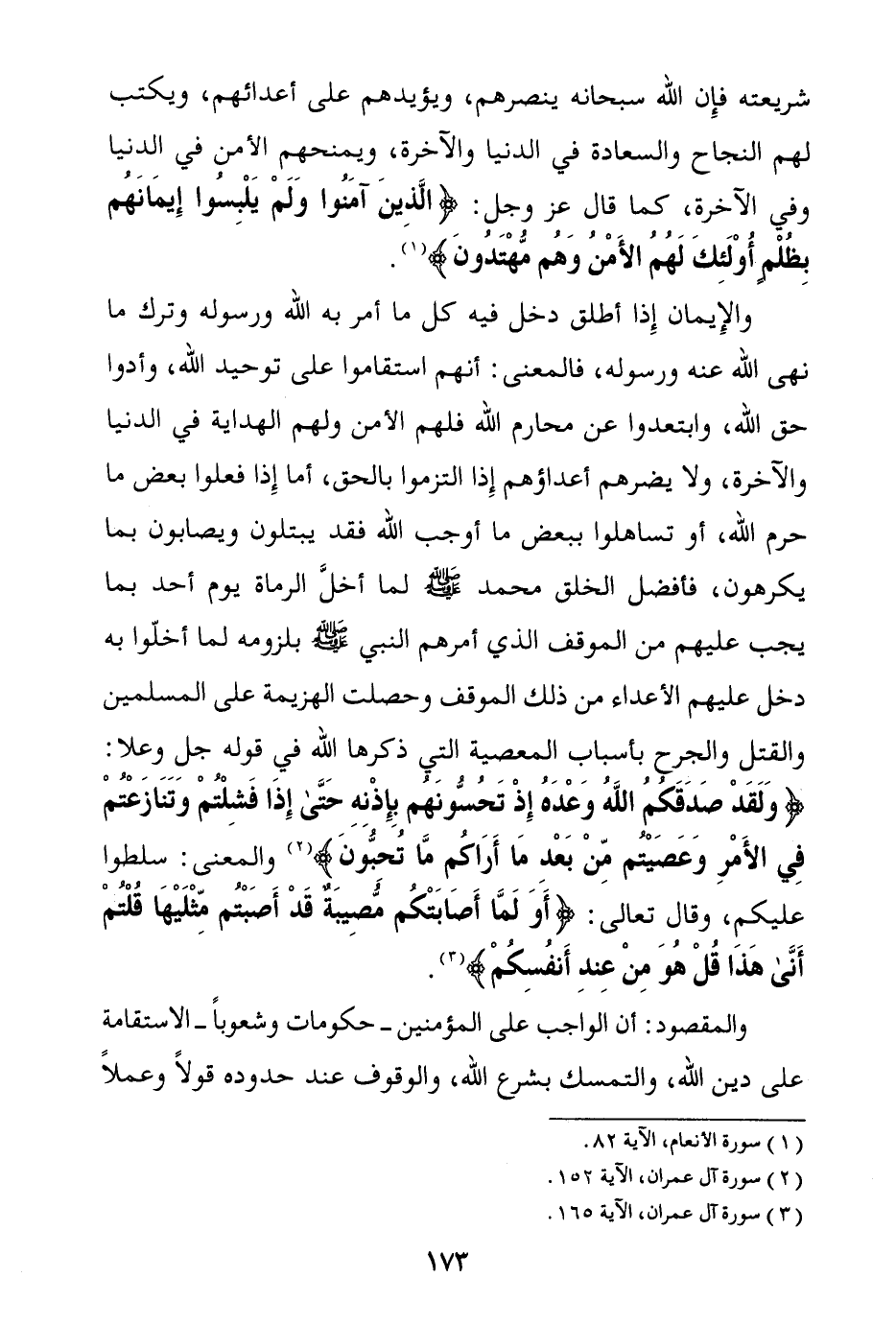 والإيمان إذا أطلق دخل فيه كل ما أمر به الله ورسوله وترك ما نهى الله عنه ورسوله، فالمعنى: أنهم استقاموا على توحيد الله، وأدوا حق الله، وابتعدوا عن محارم الله، فلهم الأمن ولهم الهداية في الدنيا والآخرة، ولا يضرهم أعداؤهم إذا التزموا بالحق، أما إذا فعلوا بعض ما حرم الله، أو تساهلوا ببعض ما أوجب الله فقد يبتلون ويصابون بما يكرهون، فأفضل الخلق محمد صلى الله عليه وسلم لما أخل الرماة يوم أحد بما يجب عليهم من الموقف الذي أمرهم النبي صلى الله عليه وسلم بلزومه لما أخلوا به دخل عليهم الأعداء من ذلك الموقف وحصلت الهزيمة على المسلمين والقتل والجرح بأسباب المعصية التي ذكرها الله في قوله جل وعلا: {وَلَقَدْ صَدَقَكُمُ اللَّهُ وَعْدَهُ إِذْ تَحُسُّونَهُمْ بِإِذْنِهِ حَتَّى إِذَا فَشِلْتُمْ وَتَنَازَعْتُمْ فِي الْأَمْرِ وَعَصَيْتُمْ مِنْ بَعْدِ مَا أَرَاكُمْ مَا تُحِبُّونَ} (¬2) والمعنى: سلطوا عليكم، وقال تعالى: {أَوَلَمَّا أَصَابَتْكُمْ مُصِيبَةٌ قَدْ أَصَبْتُمْ مِثْلَيْهَا قُلْتُمْ أَنَّى هَذَا قُلْ هُوَ مِنْ عِنْدِ أَنْفُسِكُمْ} (¬3)
