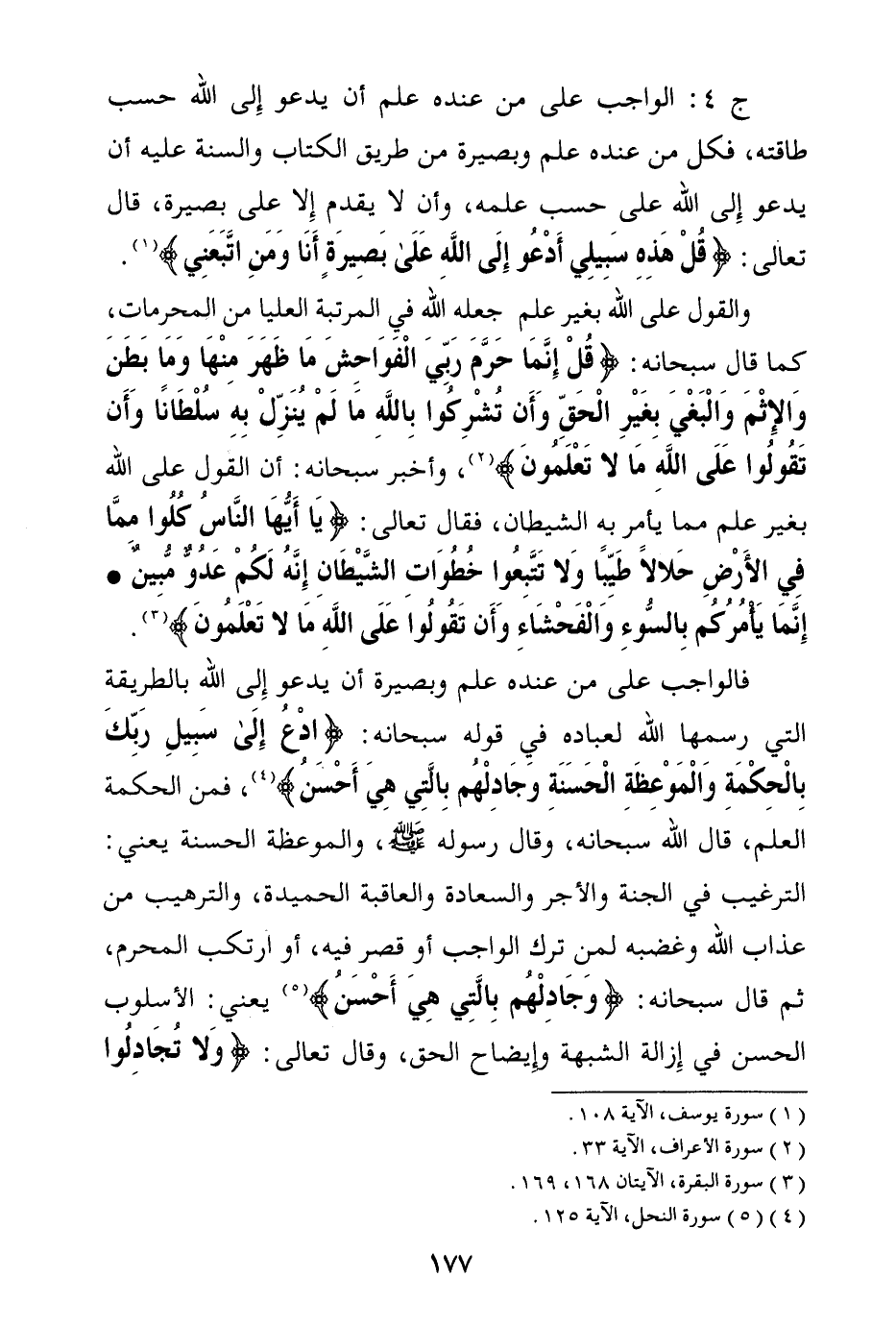 فالواجب على من عنده علم وبصيرة أن يدعو إلى الله بالطريقة التي رسمها الله لعباده في قوله سبحانه: {ادْعُ إِلَى سَبِيلِ رَبِّكَ بِالْحِكْمَةِ وَالْمَوْعِظَةِ الْحَسَنَةِ وَجَادِلْهُمْ بِالَّتِي هِيَ أَحْسَنُ} (¬5) فمن الحكمة العلم، قال الله سبحانه، وقال رسوله صلى الله عليه وسلم، والموعظة الحسنة يعني: الترغيب في الجنة والأجر والسعادة والعاقبة الحميدة، والترهيب من عذاب الله وغضبه لمن ترك الواجب أو قصر فيه، أو ارتكب المحرم، ثم قال سبحانه: {وَجَادِلْهُمْ بِالَّتِي هِيَ أَحْسَنُ} (¬6) يعني: الأسلوب الحسن في إزالة الشبهة وإيضاح الحق، وقال تعالى: {وَلَا تُجَادِلُوا أَهْلَ الْكِتَابِ إِلَّا بِالَّتِي هِيَ أَحْسَنُ إِلَّا الَّذِينَ ظَلَمُوا مِنْهُمْ} (¬7)