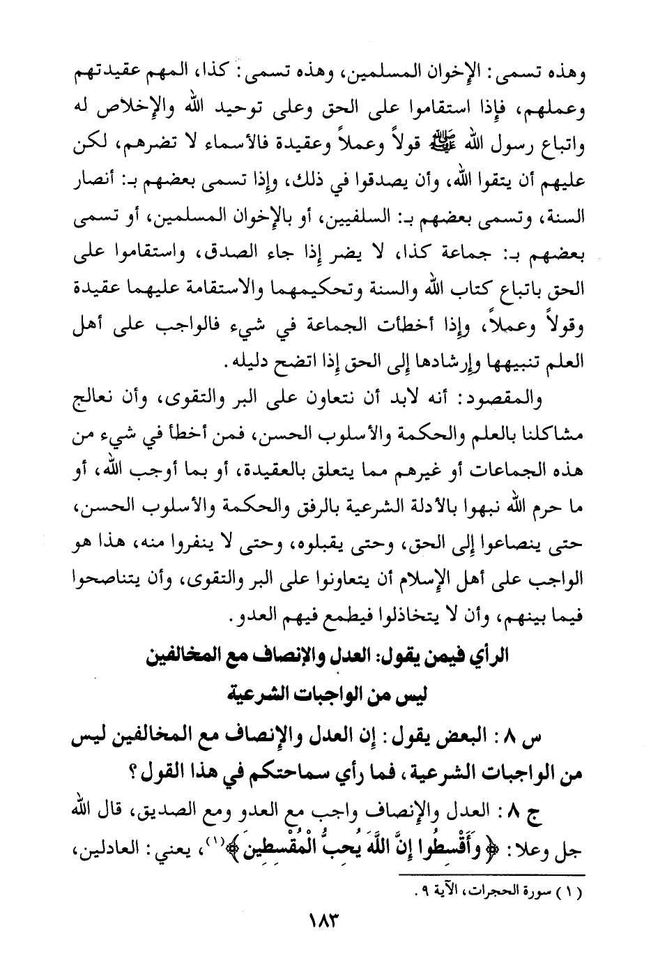 س 8: البعض يقول: إن العدل والإنصاف مع المخالفين ليس من الواجبات الشرعية، فما رأي سماحتكم في هذا القول؟ .