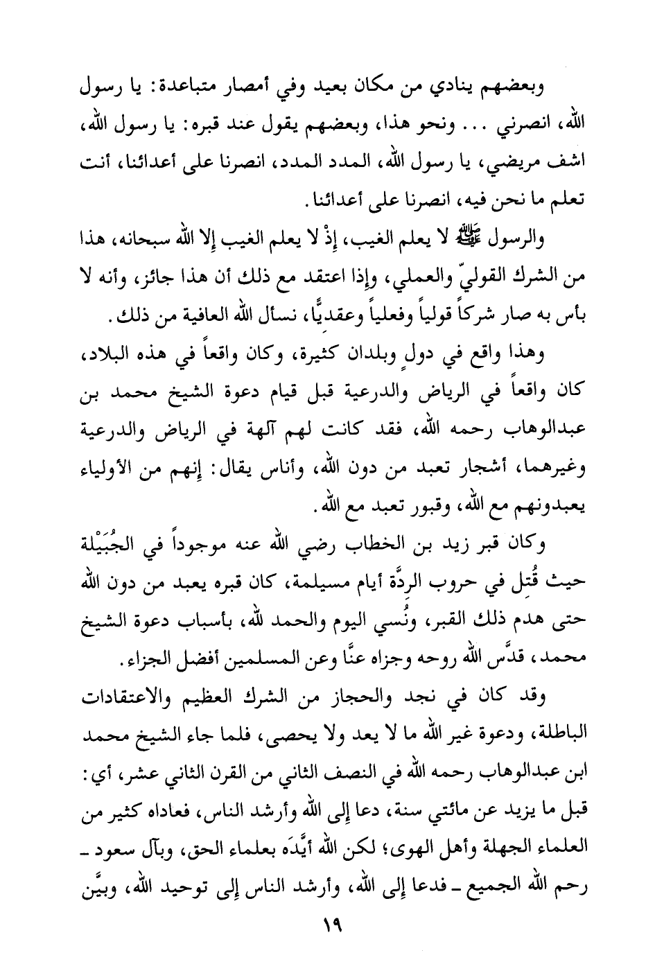 وبعضهم ينادي من مكان بعيد وفي أمصار متباعدة: يا رسول الله، انصرني. . . ونحو هذا، وبعضهم يقول عند قبره: يا رسول الله، اشف مريضي، يا رسول الله، المدد المدد، انصرنا على أعدائنا، أنت تعلم ما نحن فيه، انصرنا على أعدائنا.